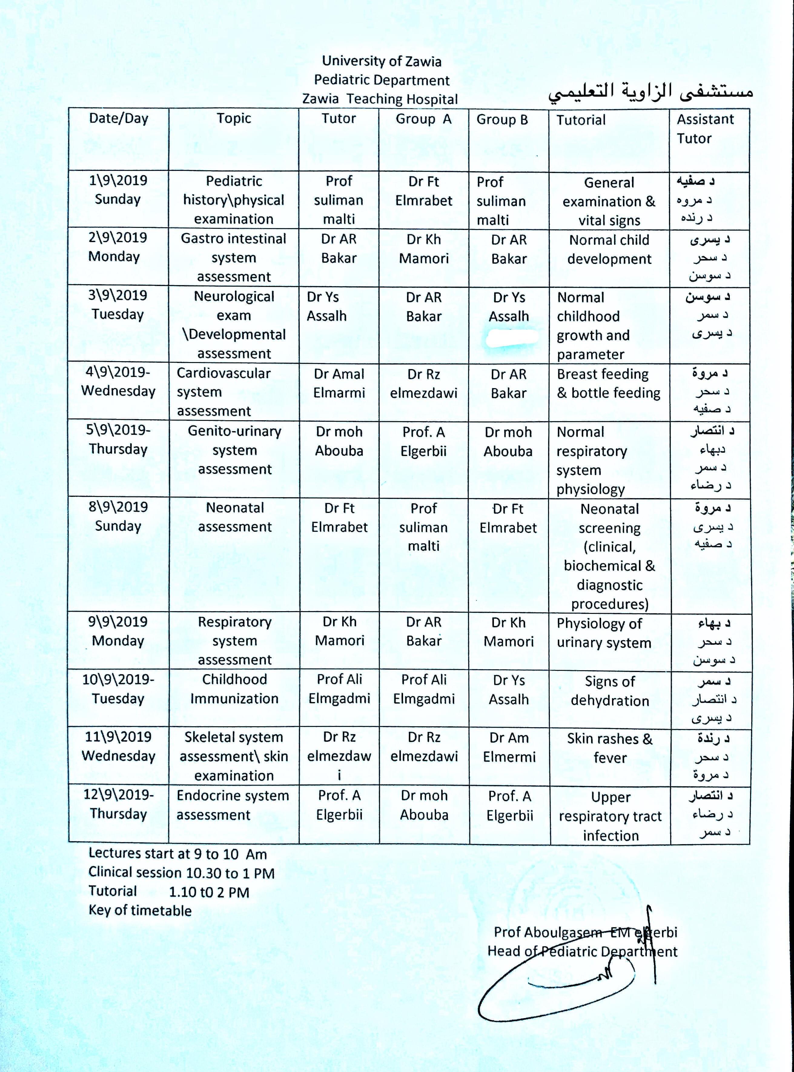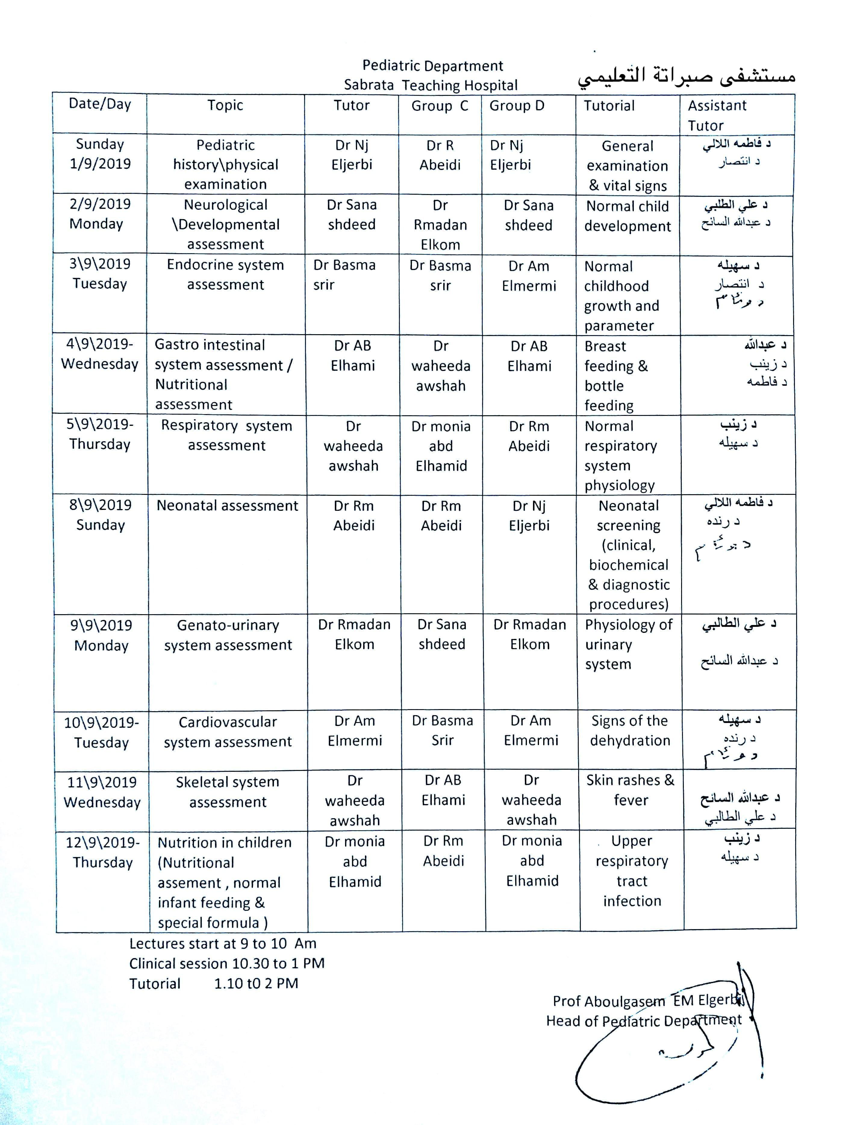 جدول المحاضرات لمادة طب الأطفال من 1-9-2019 الى 12-9-2019