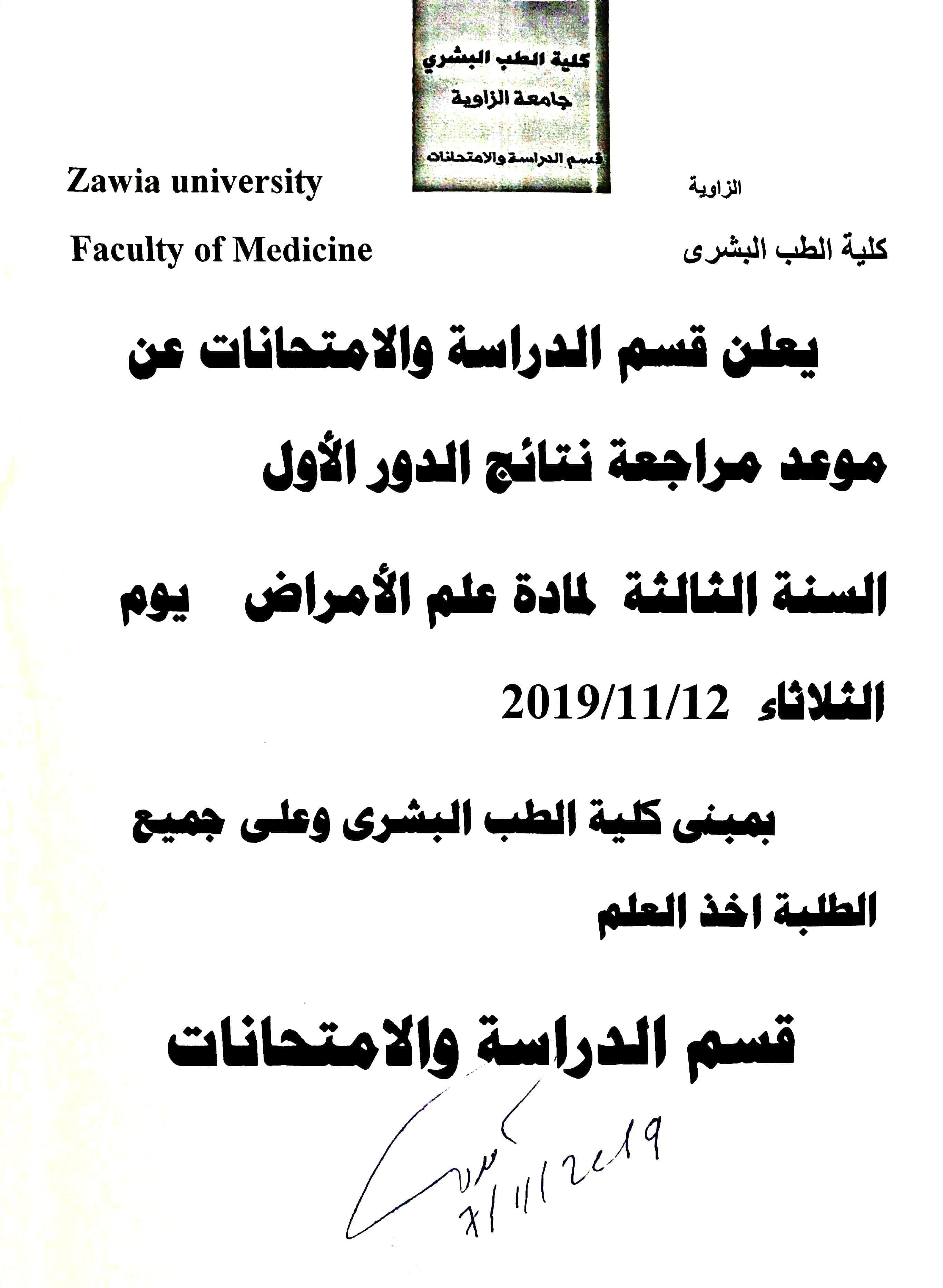 مواعيد مراجعة نتائج الدور الأول للسنة الثالثة طب بشري.