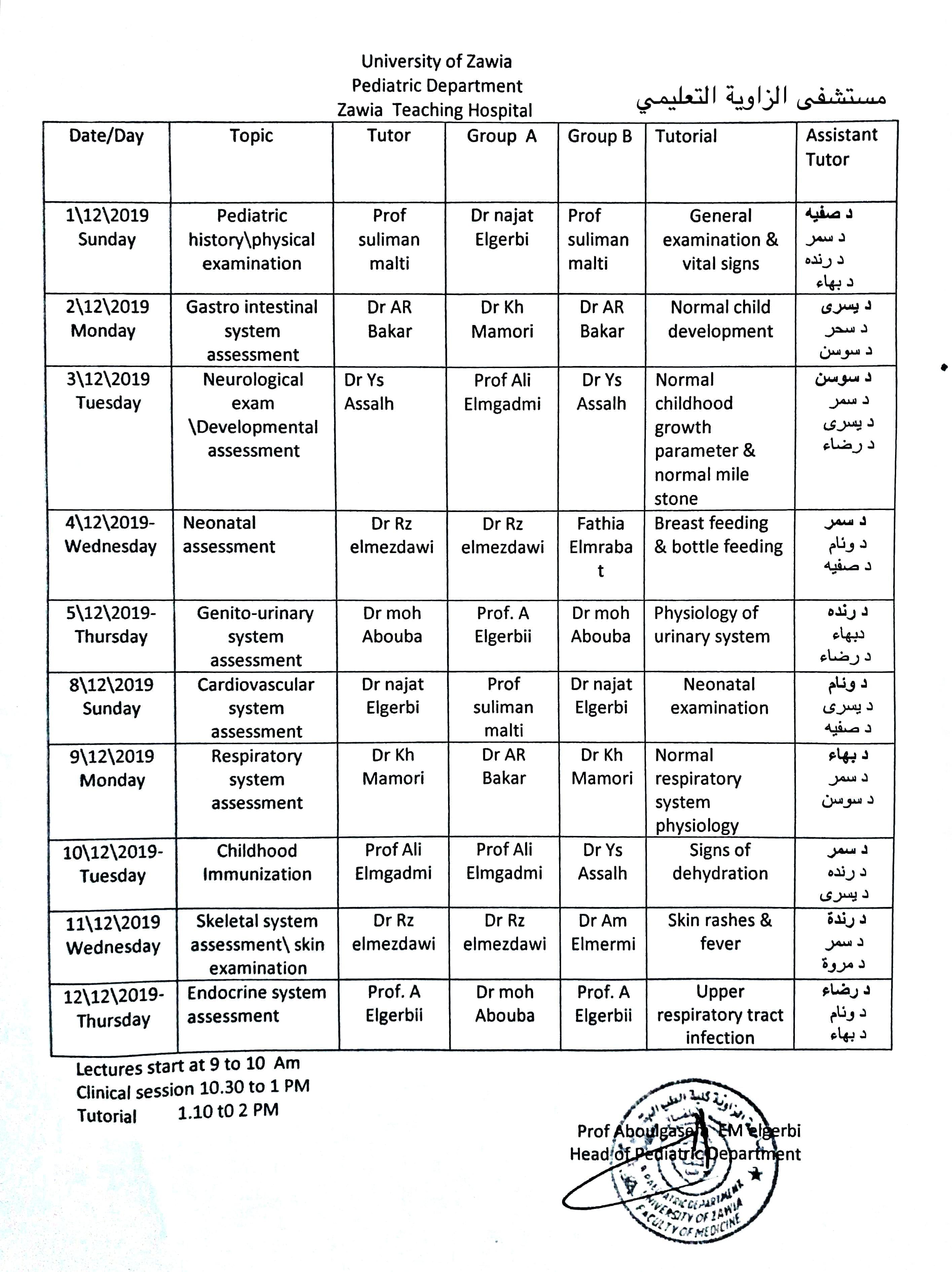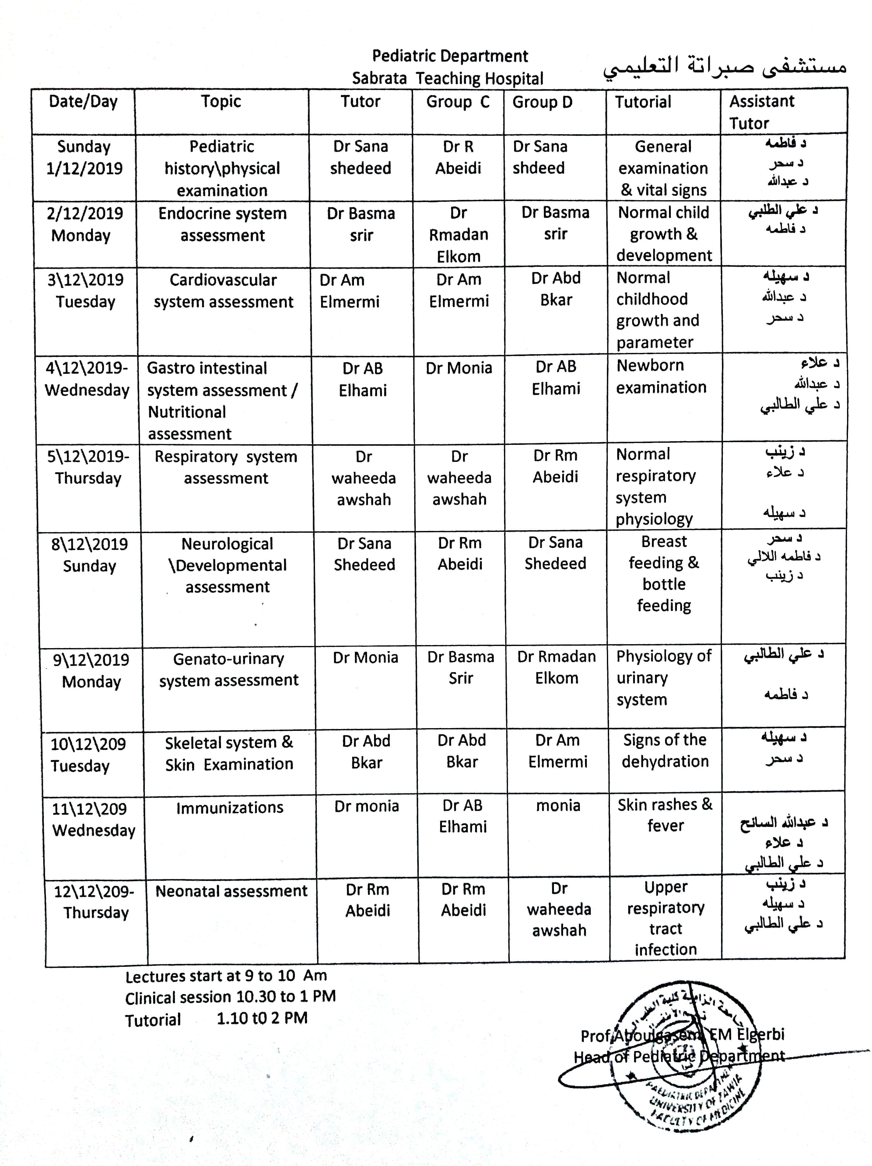 جدول المحاضرات لمادة الأطفال للسنة الخامسة الدفعة 15