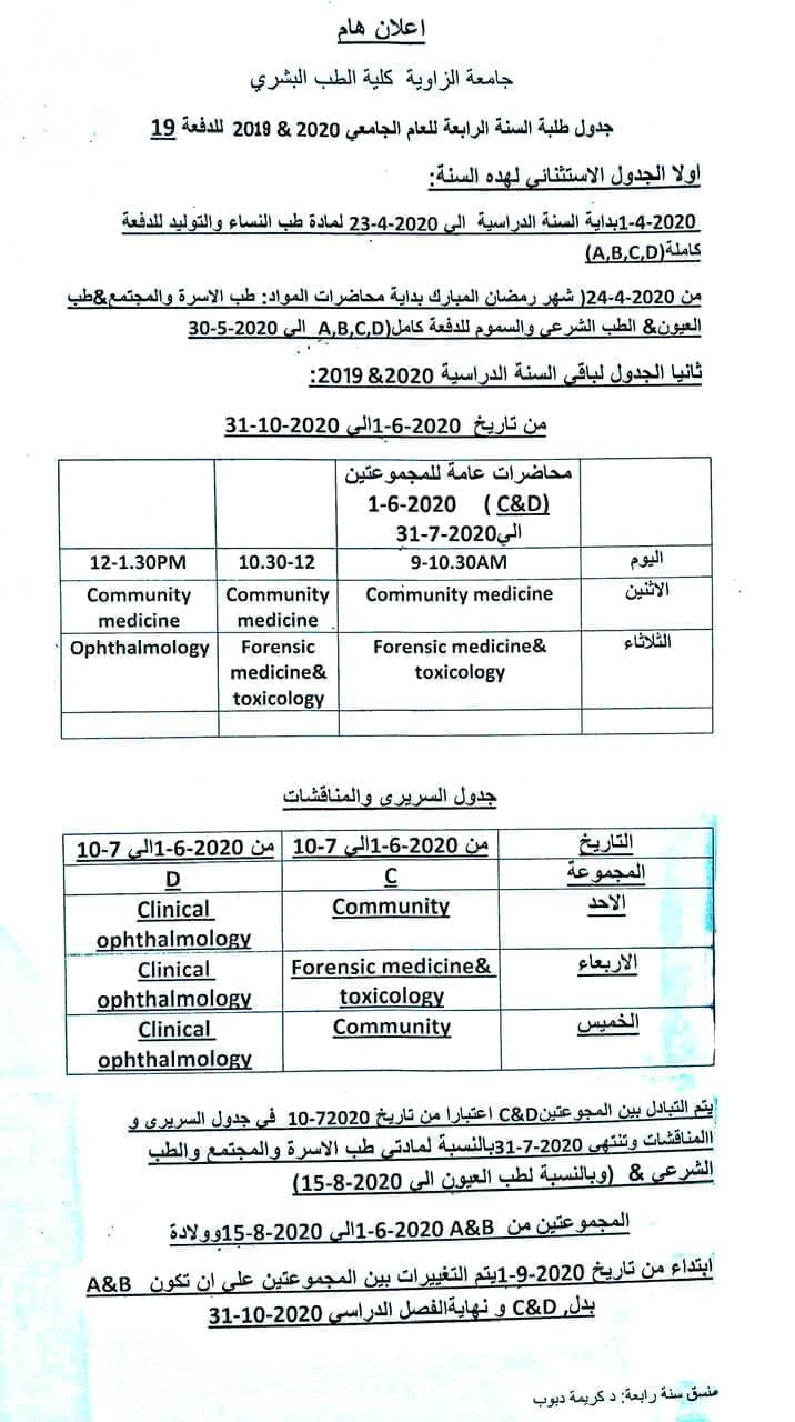 الجدول الدراسي للسنة الرابعة الدفعة 19 للعام الجامعي 2019-2020.