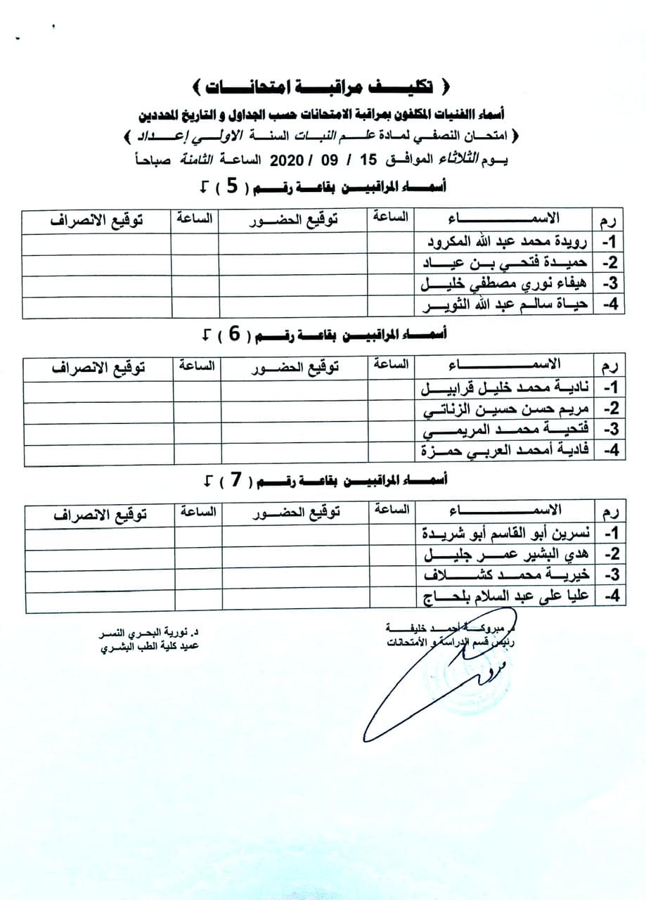 اسماء المكلفين بمراقبة الامتحانات النصفية لسنة الاعداد طب بشري للعام الجامعي 2019-2020.