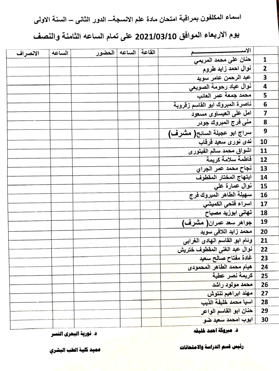 أسماء المكلفين بمراقبة امتحان الدور الثاني للسنة الأولى طب بشري للعام الجامعي 2019-2020