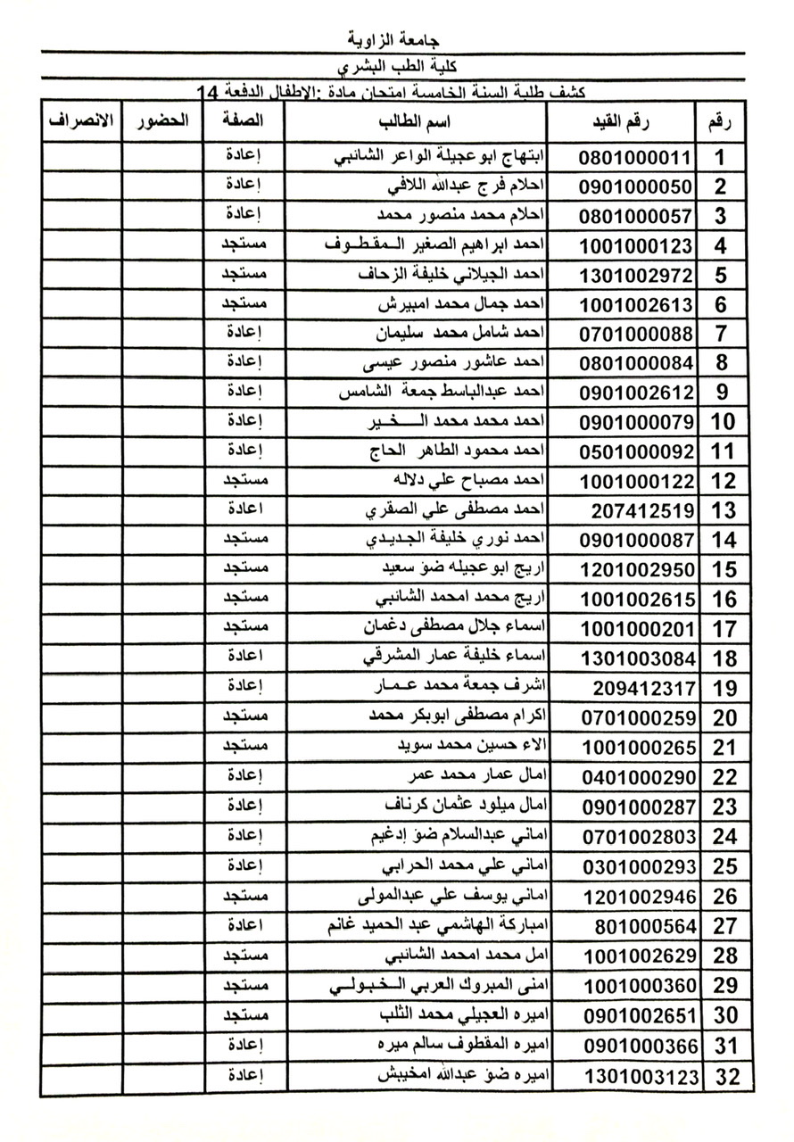 توزيع المجموعات الامتحان السريري الدور الثاني للسنة الخامسة الدفعة 14  بمستشفى الزاوية التعليمي.