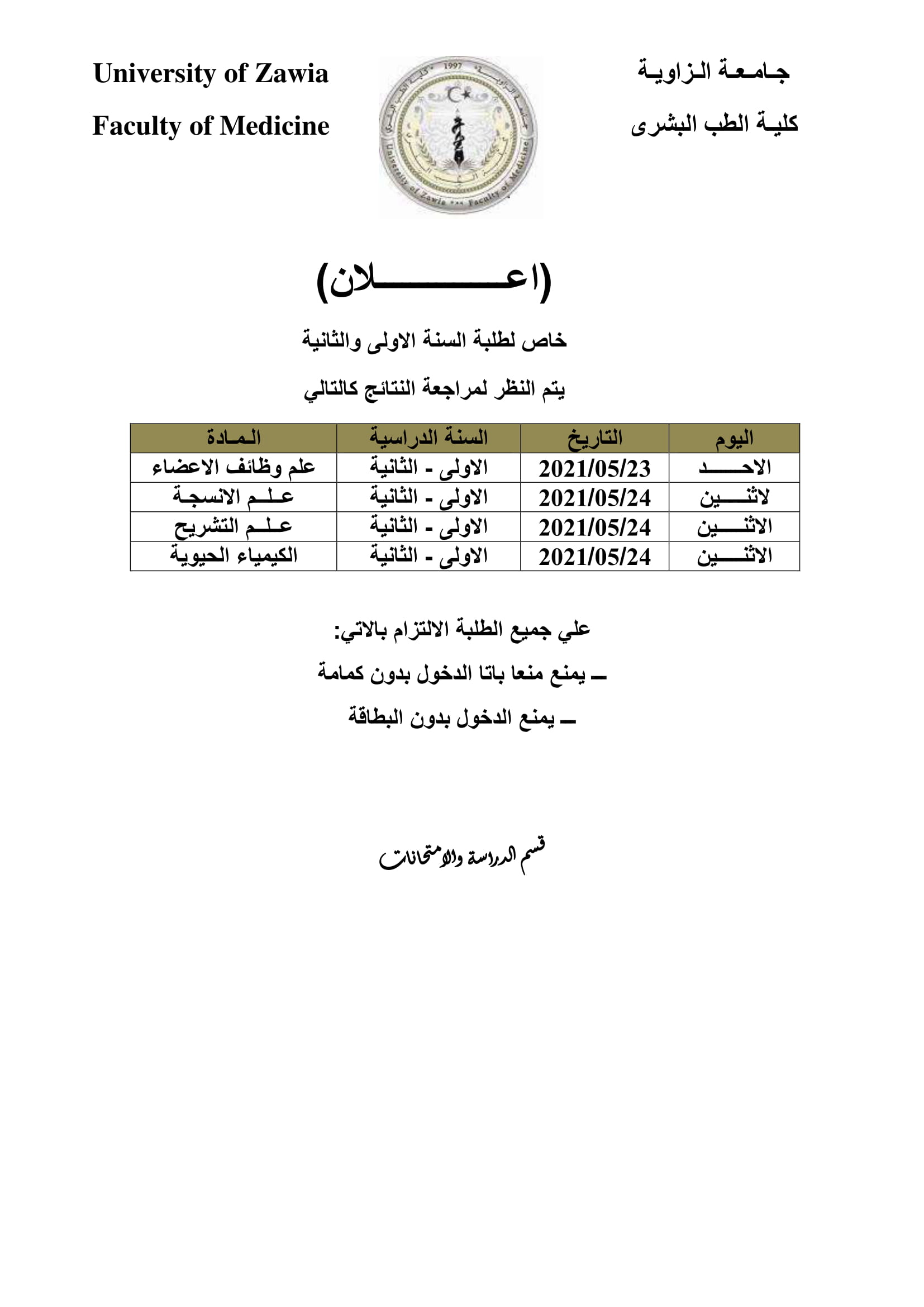 مواعيد مراجعة نتائج الدور الثاني للسنوات الأولى والثانية والرابعة الدفعة 18.17 حسب الجدول المبين ادناه