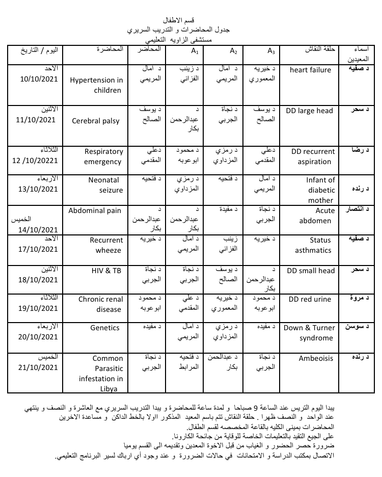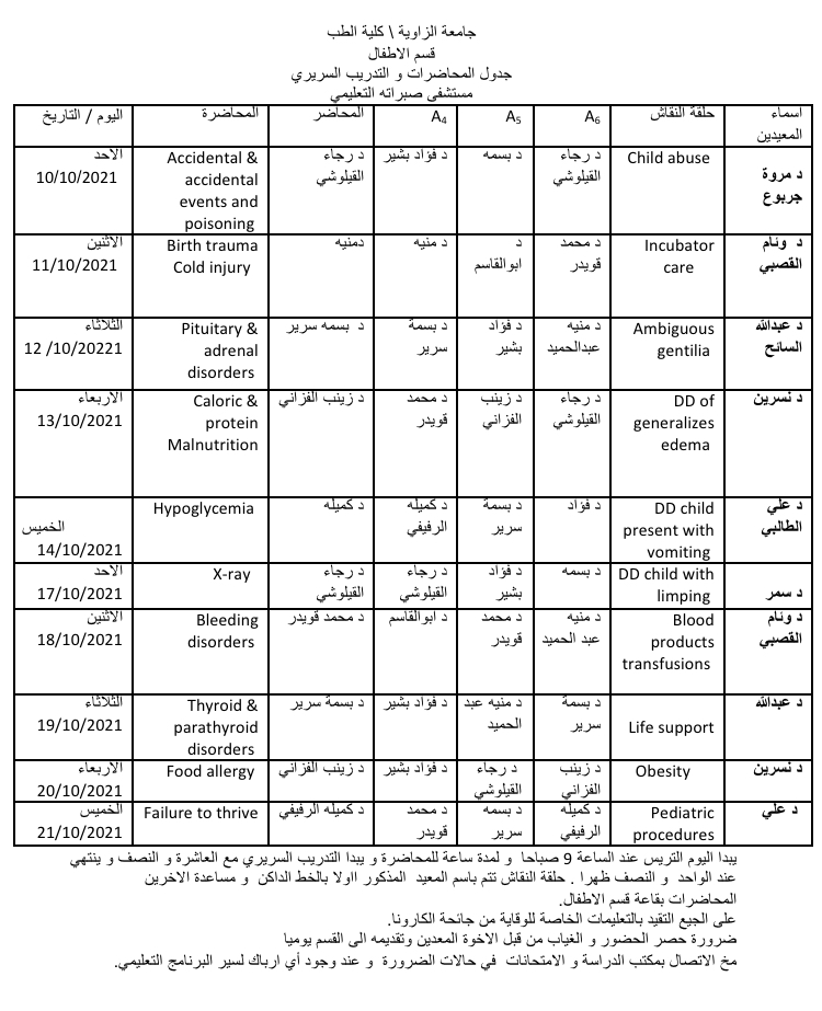 جدول المحاضرات والتدريب السريري لمادة الأطفال للسنة الخامسة الدفعة 16.