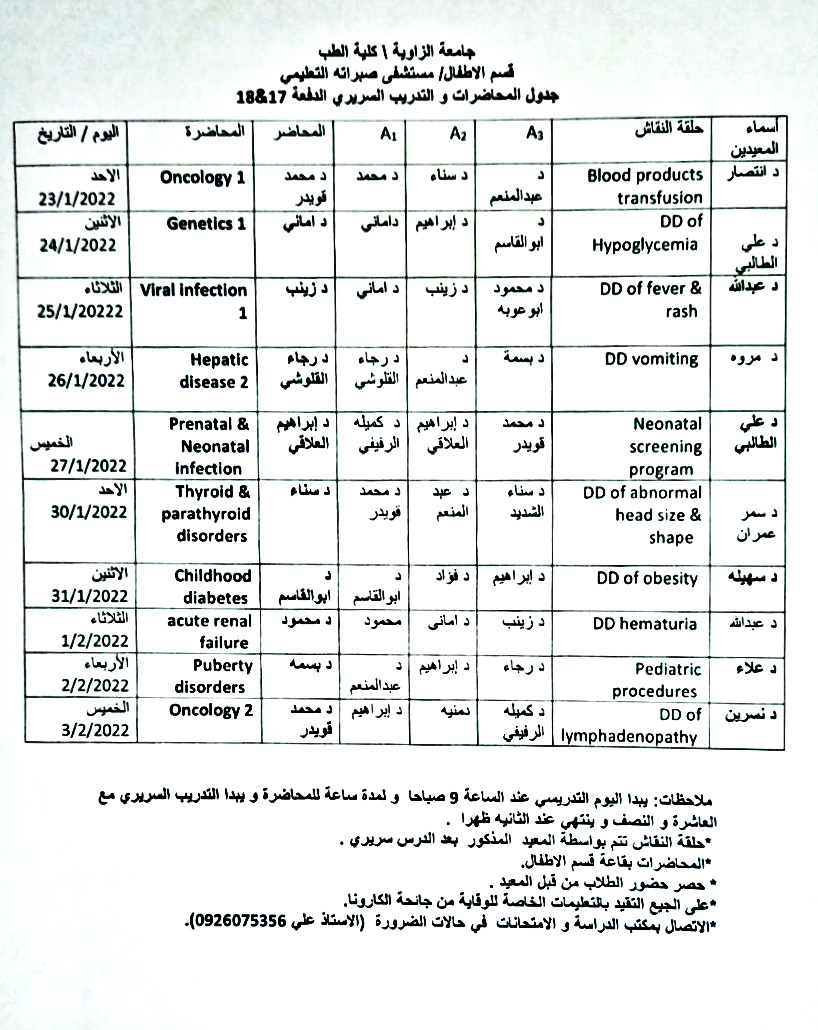 جدول المحاضرات السريرية لمادة الاطفال للسنة الخامسة الدفعة 18،17