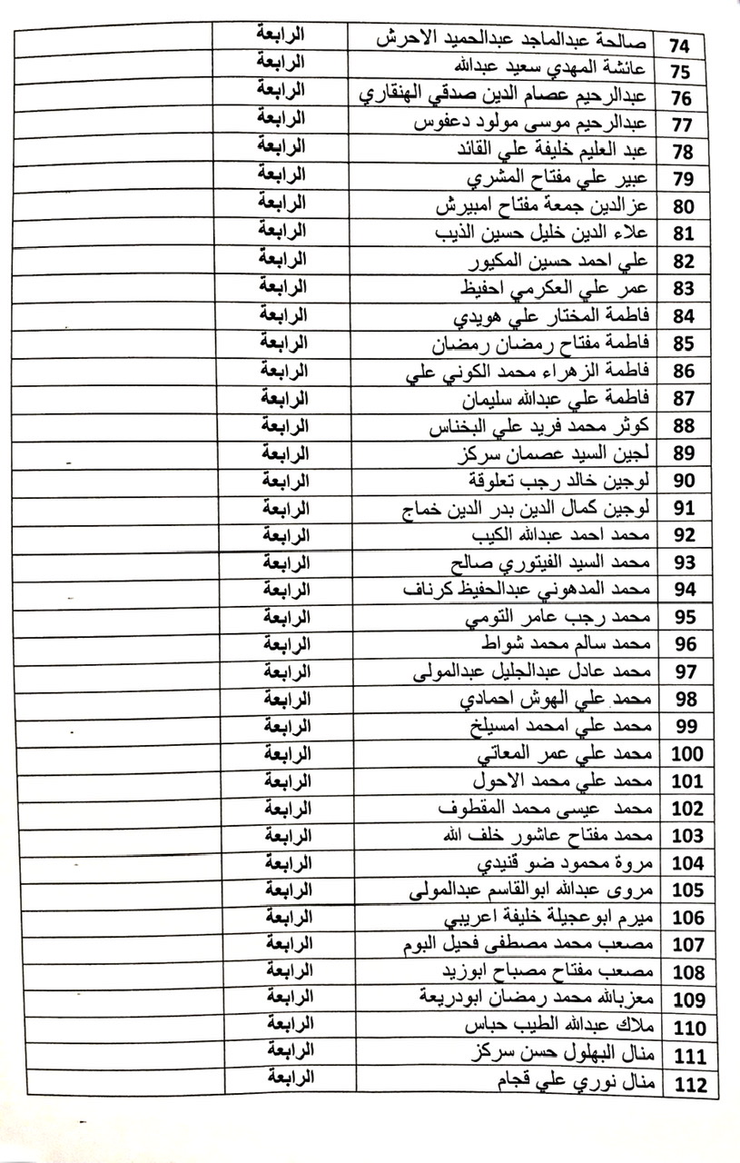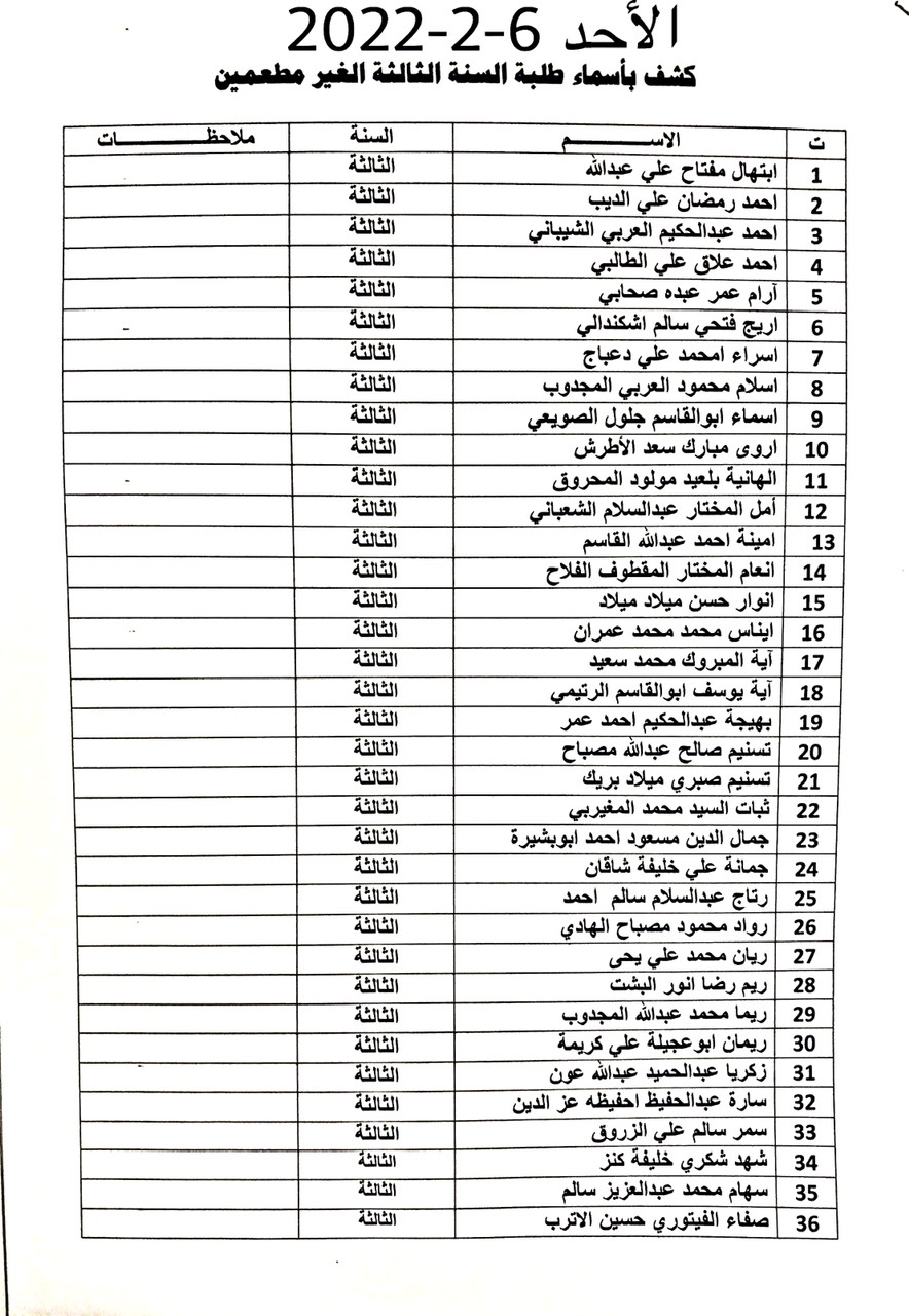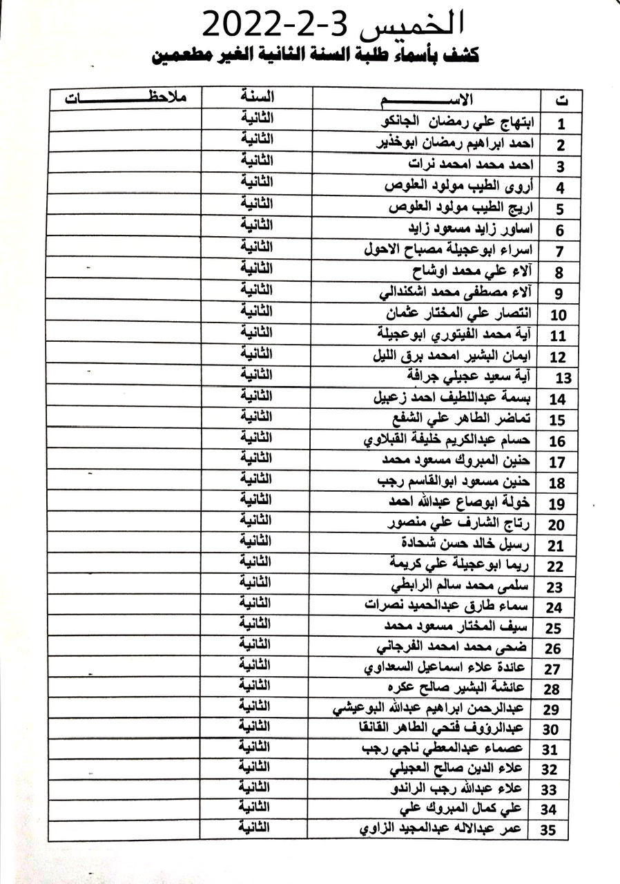 على الطلبة المدرجة أسماؤهم في القوائم مراجعة مكتب المسجل كل حسب الأيام المحددة في القوائم واحضار مايثبت تلقيهم التطعيم ضد فايروس كورونا .