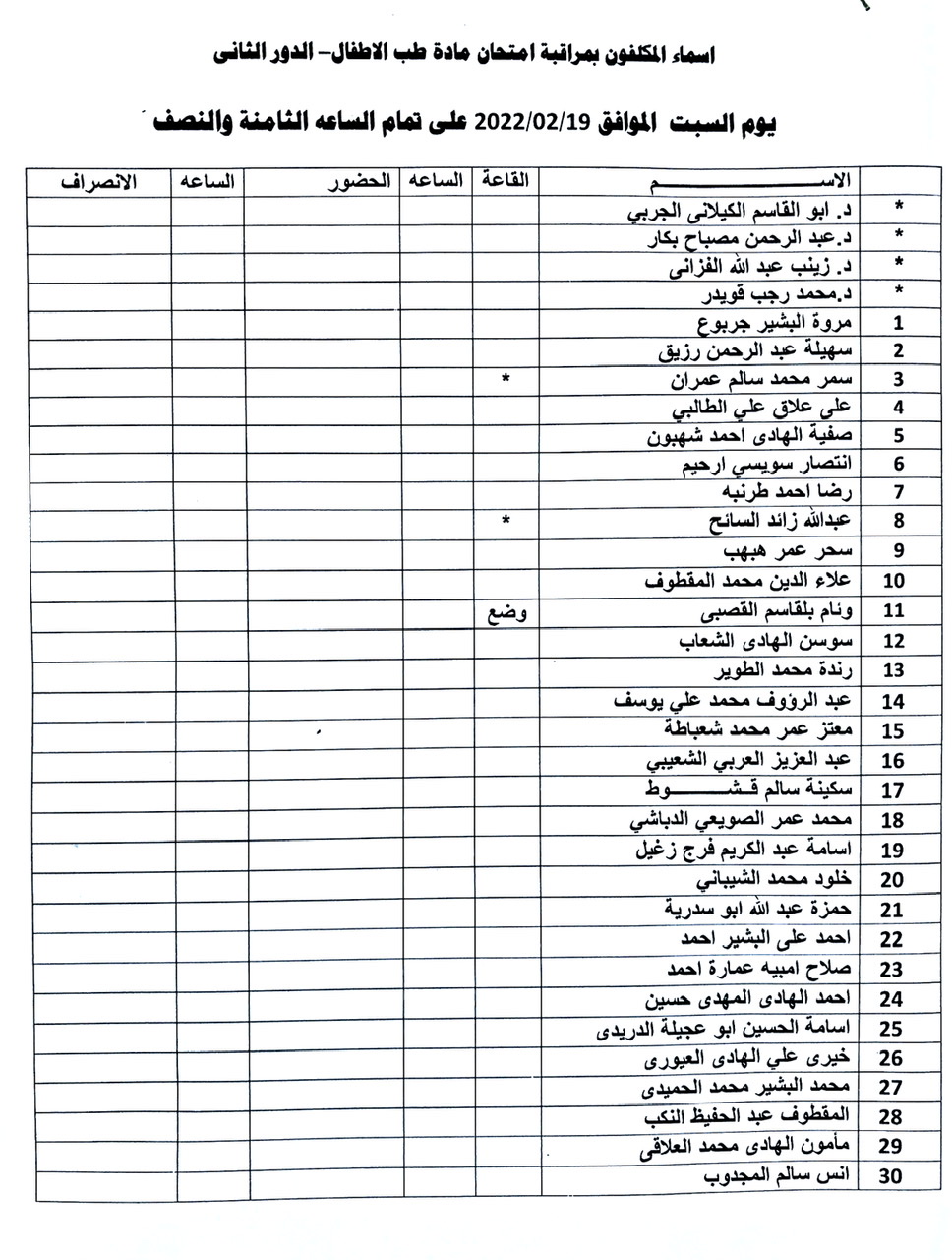 أسماء المكلفين بمراقبة امتحان الدور الثاني لمادة الاطفال للسنة الخامسة الدفعة 15 وذلك يوم السبت الموافق 19-2-2022 الساعة الـ08:30 صباحاً