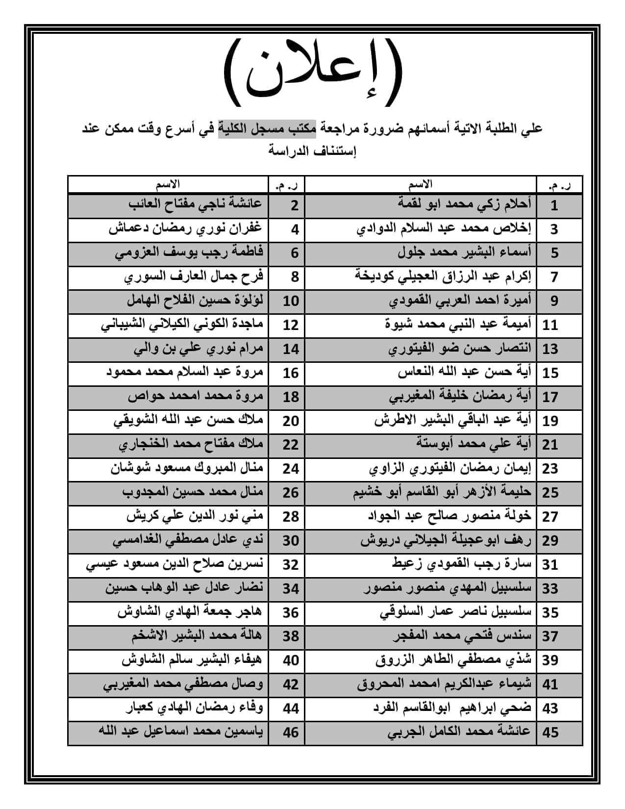 علي الطلبة الاتية أسمائهم ضرورة مراجعة مكتب مسجل الكلية في أسرع وقت ممكن عند إستئناف الدراسة