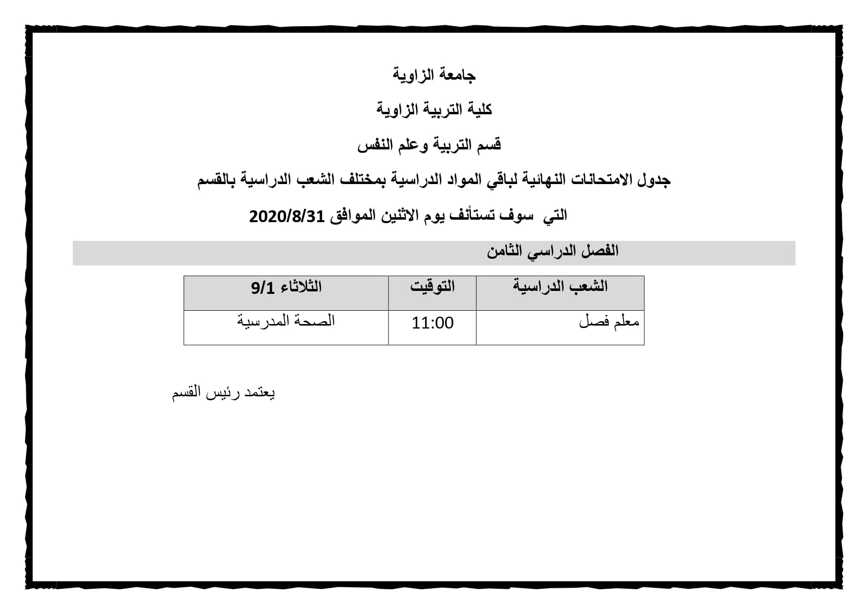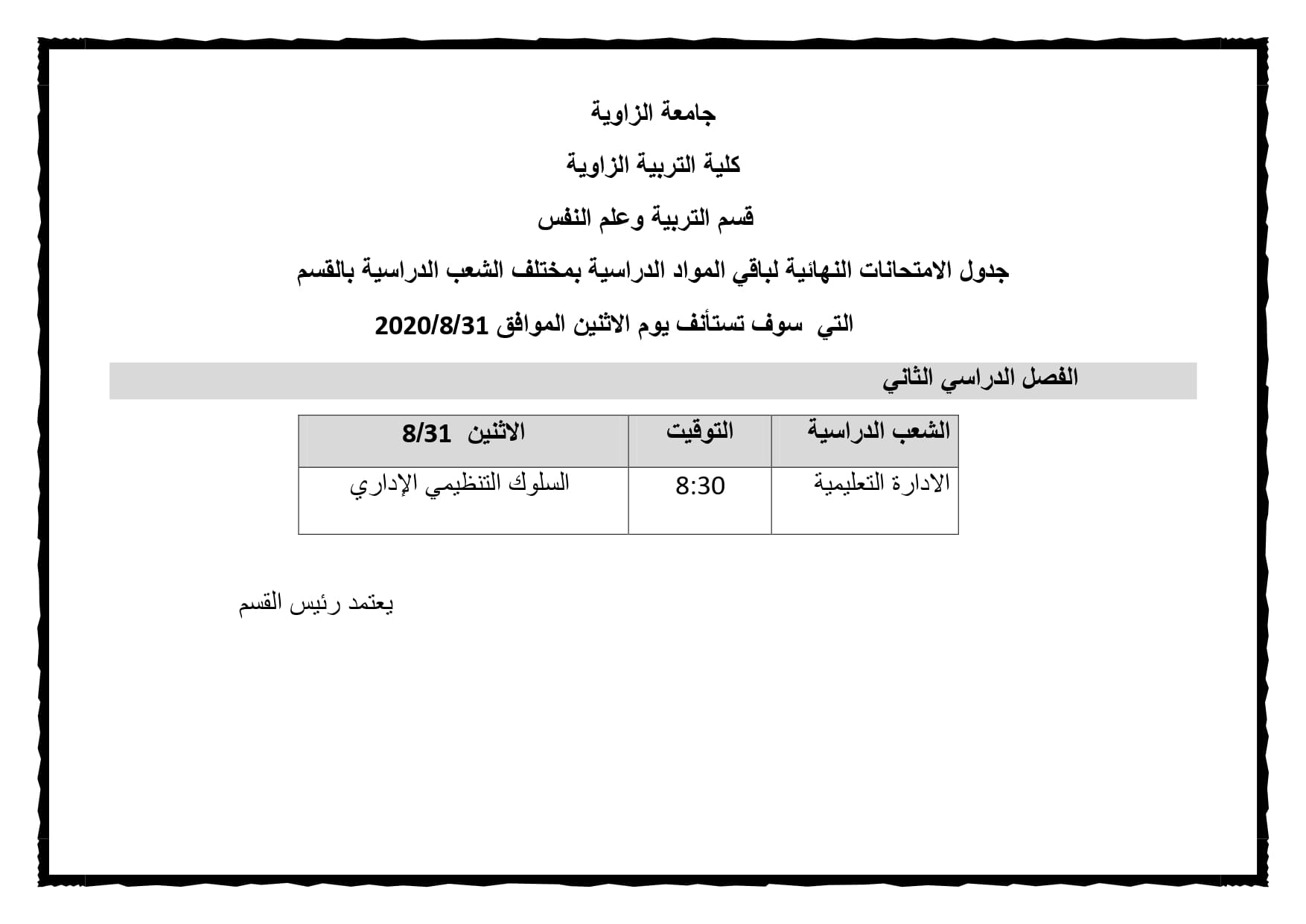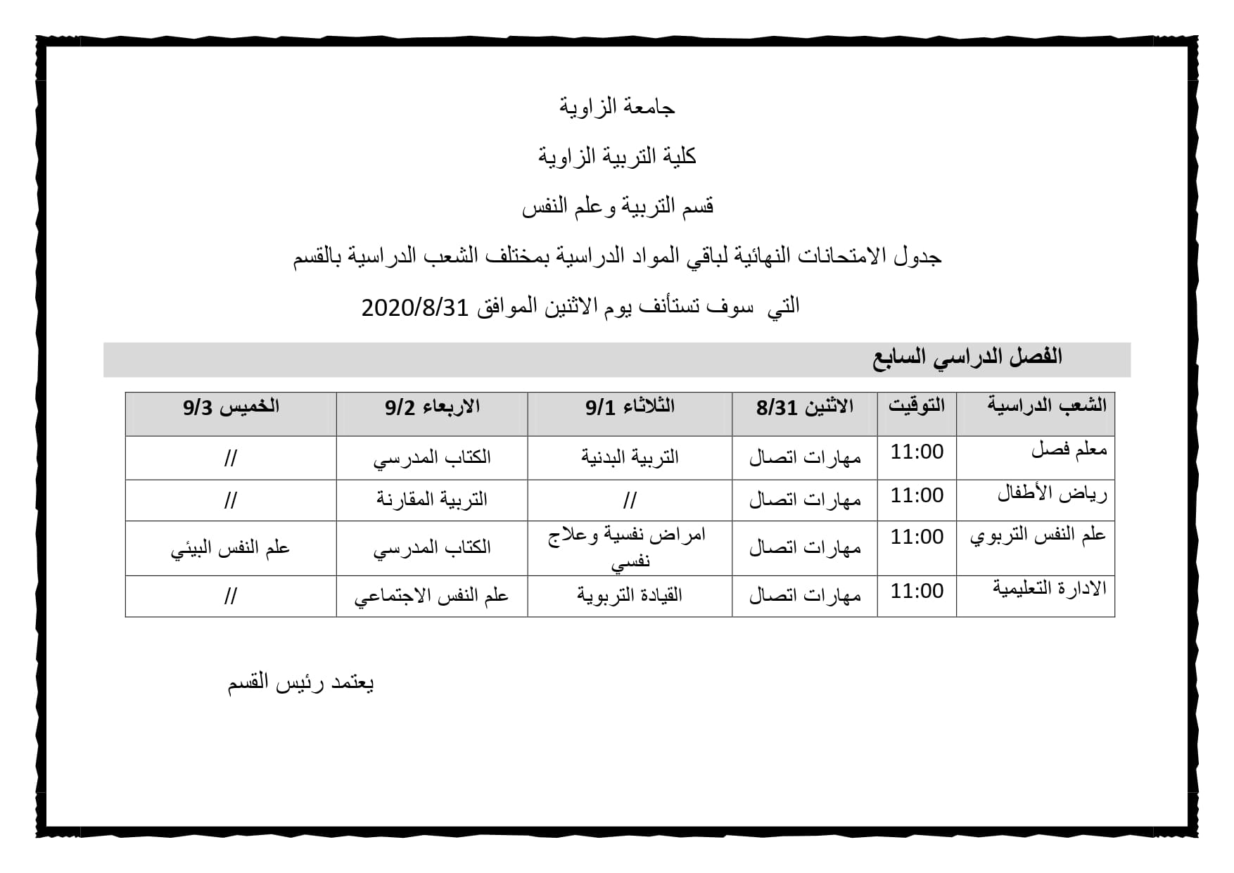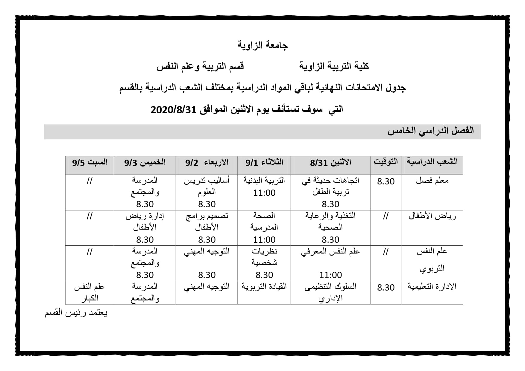 جدول إستكمال الإمتحانات النهائية ( قسم التربية و علم النفس )