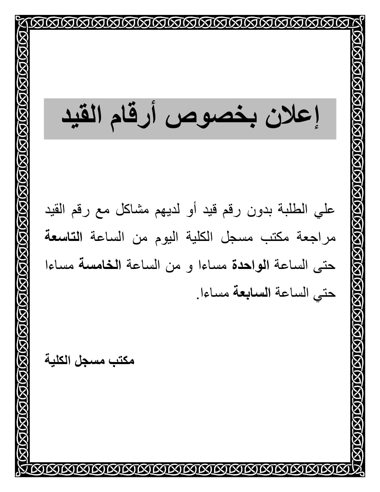 علي الطلبة بدون رقم قيد أو لديهم مشاكل مع رقم القيد مراجعة مكتب مسجل الكلية اليوم من الساعة التاسعة حتى الساعة الواحدة مساءا و من الساعة الخامسة مساءا حتي الساعة السابعة مساءا.