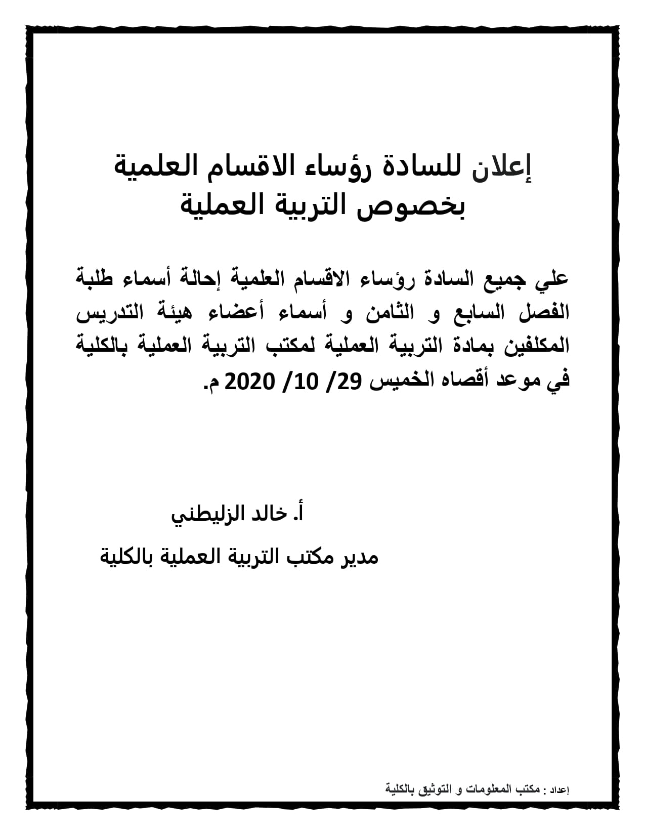 علي جميع السادة رؤساء الاقسام العلمية إحالة أسماء طلبة الفصل السابع و الثامن و أسماء أعضاء هيئة التدريس المكلفين بمادة التربية العملية لمكتب التربية العملية بالكلية في موعد أقصاه الخميس 29/ 10/ 2020م.
