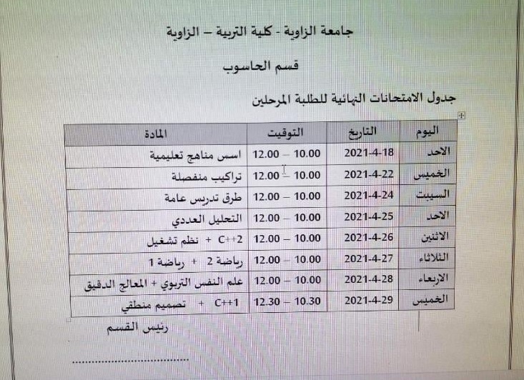 جدول الامتحانات النهائية للطلبة المرحلين قسم الحاسوب