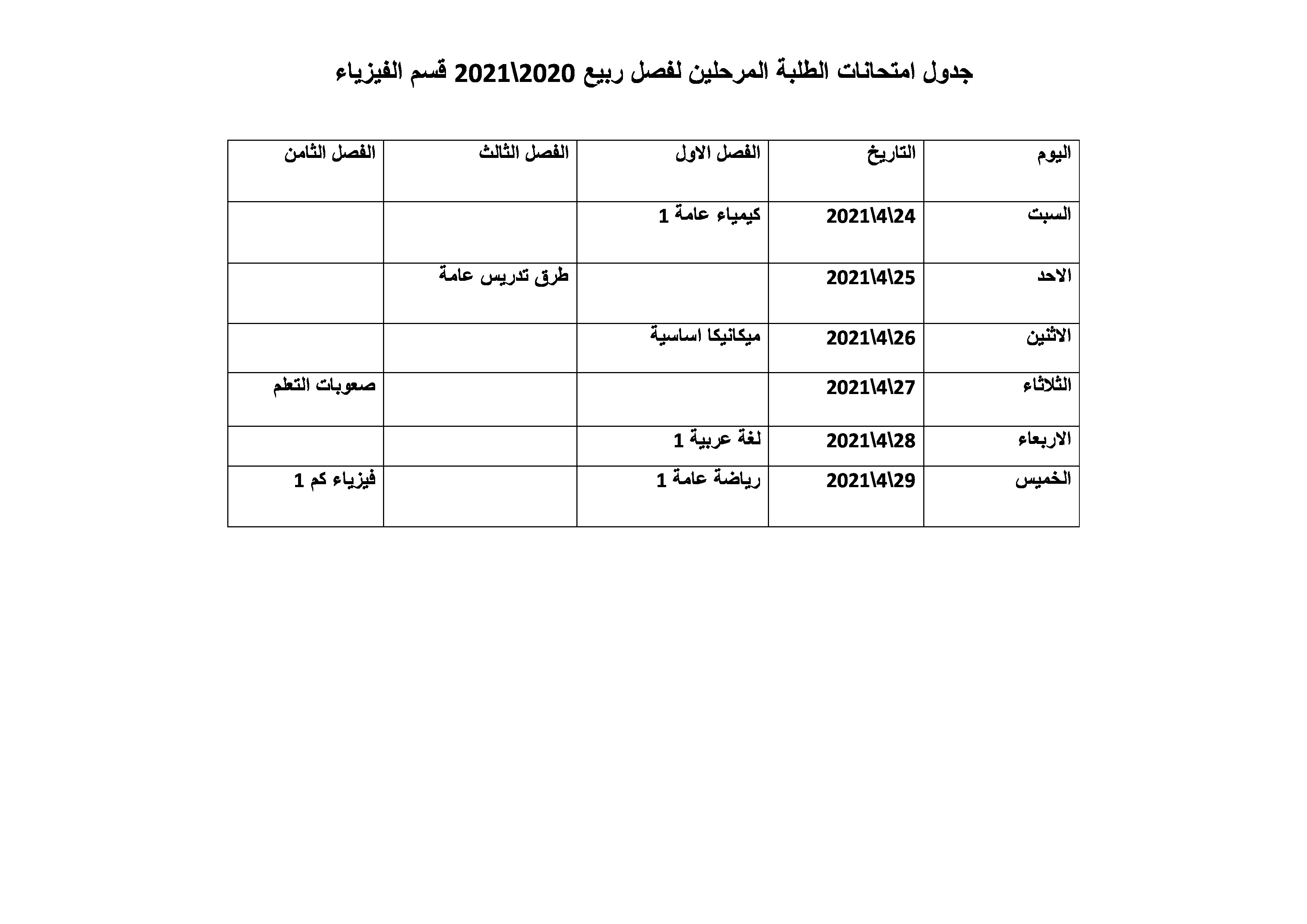 جدول امتحانات الطلبة المرحلين لفصل ربيع 2020\2021 قسم الفيزياء