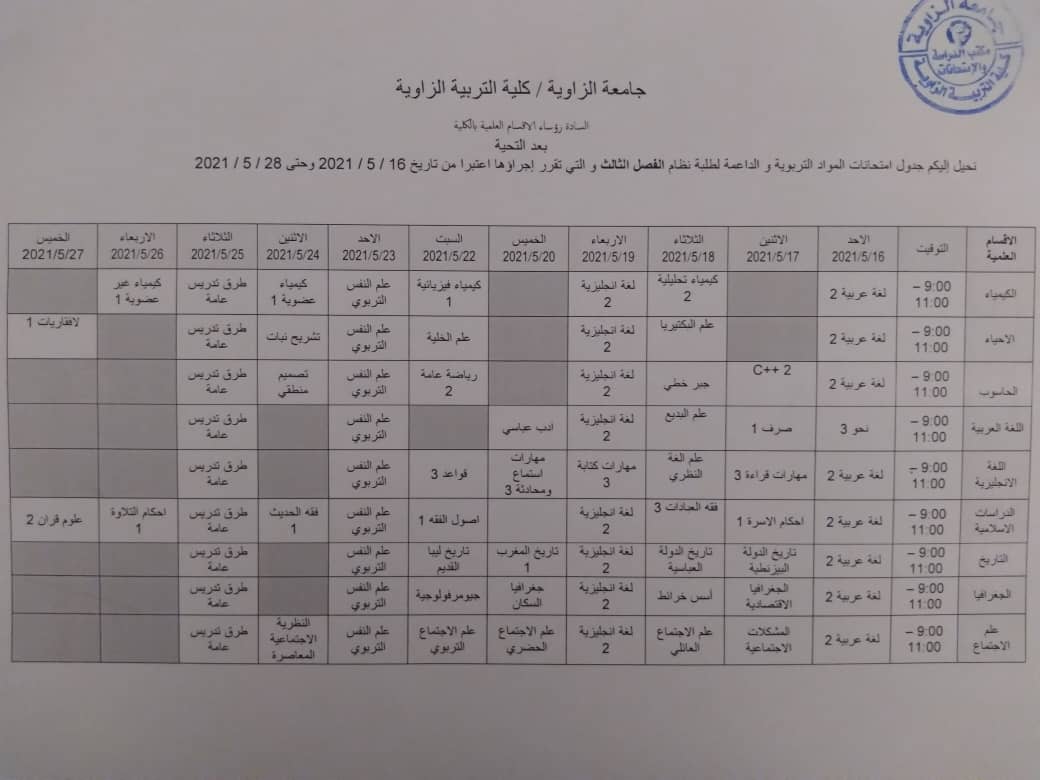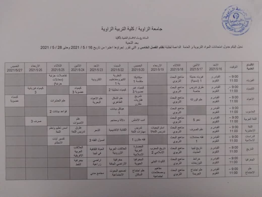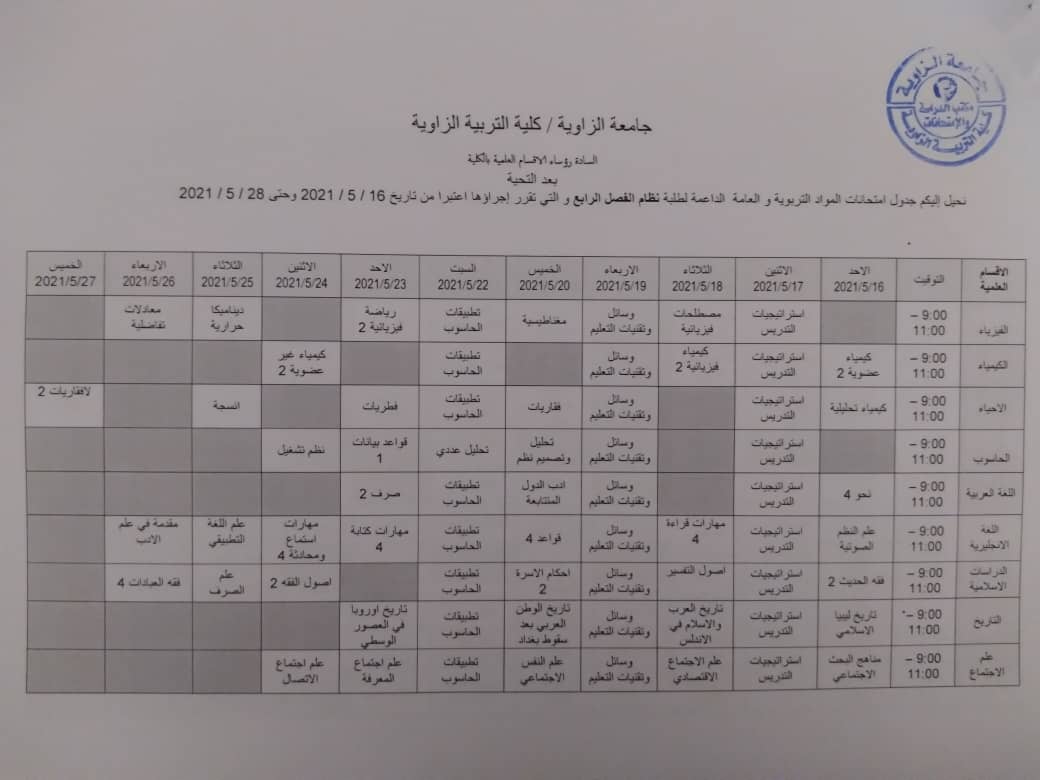 جدول الامتحانات النهائية لجميع الاقسام عد قسمي الرياضيات والتربية وعلم النفس