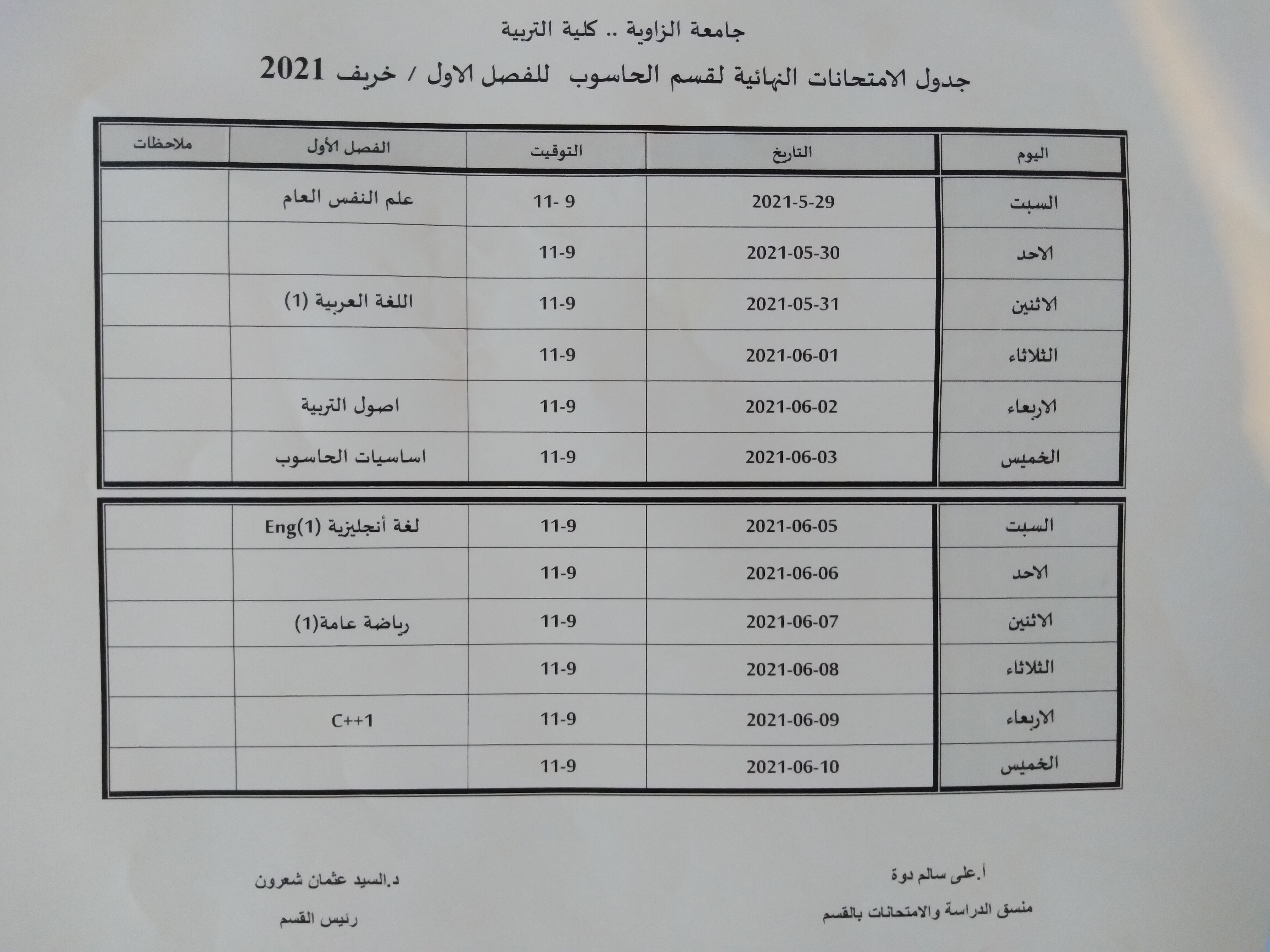 جدول الامتحان النهائي للفصل الأول بقسم الحاسوب