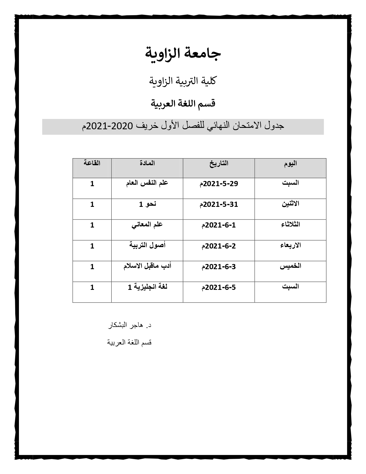 جدول الامتحان النهائي للفصل الأول بقسم اللغة العربية