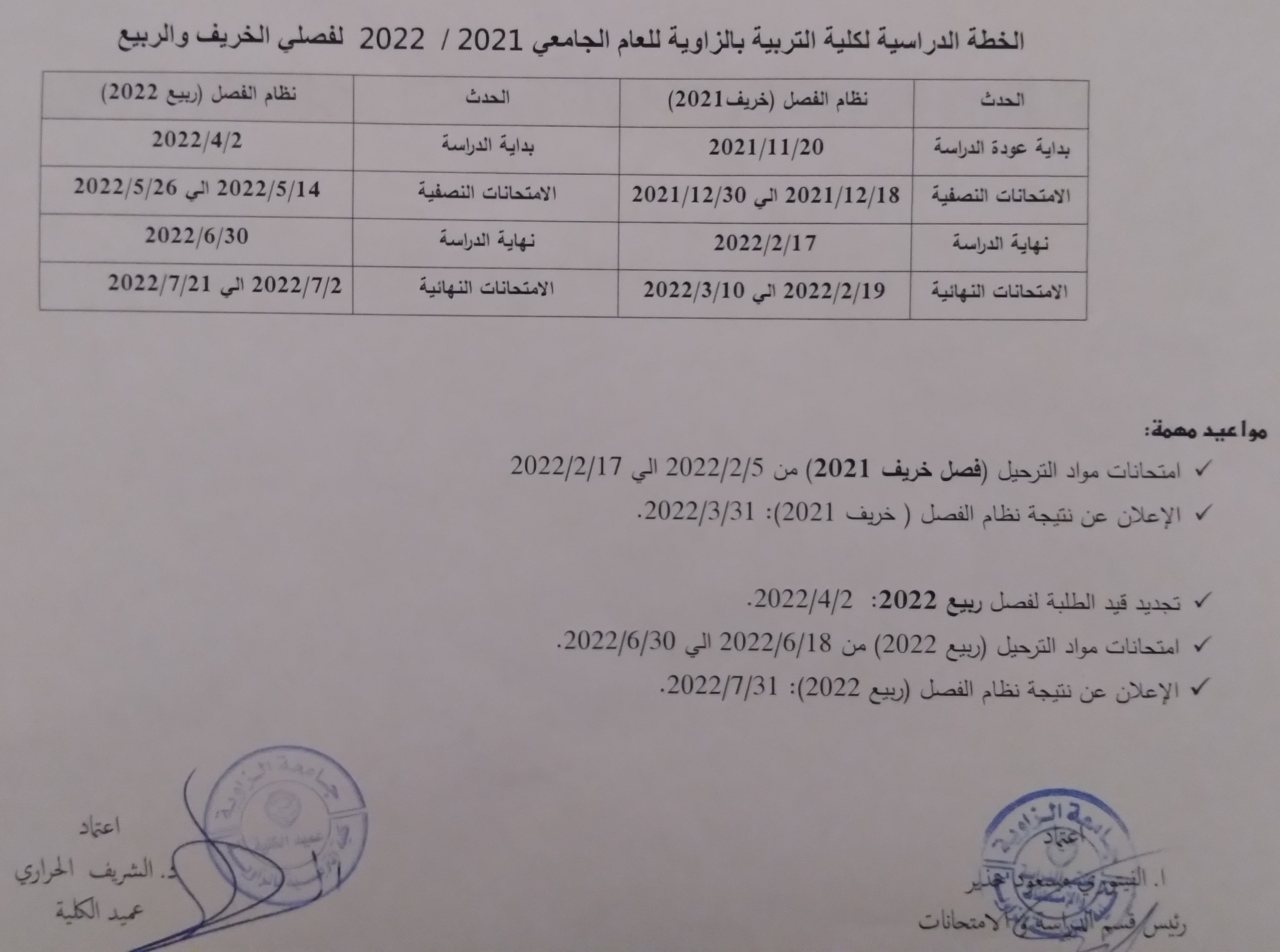 الخطة الدراسية لكلية التربية الزاوية للعام الجامعي 2021 /2022