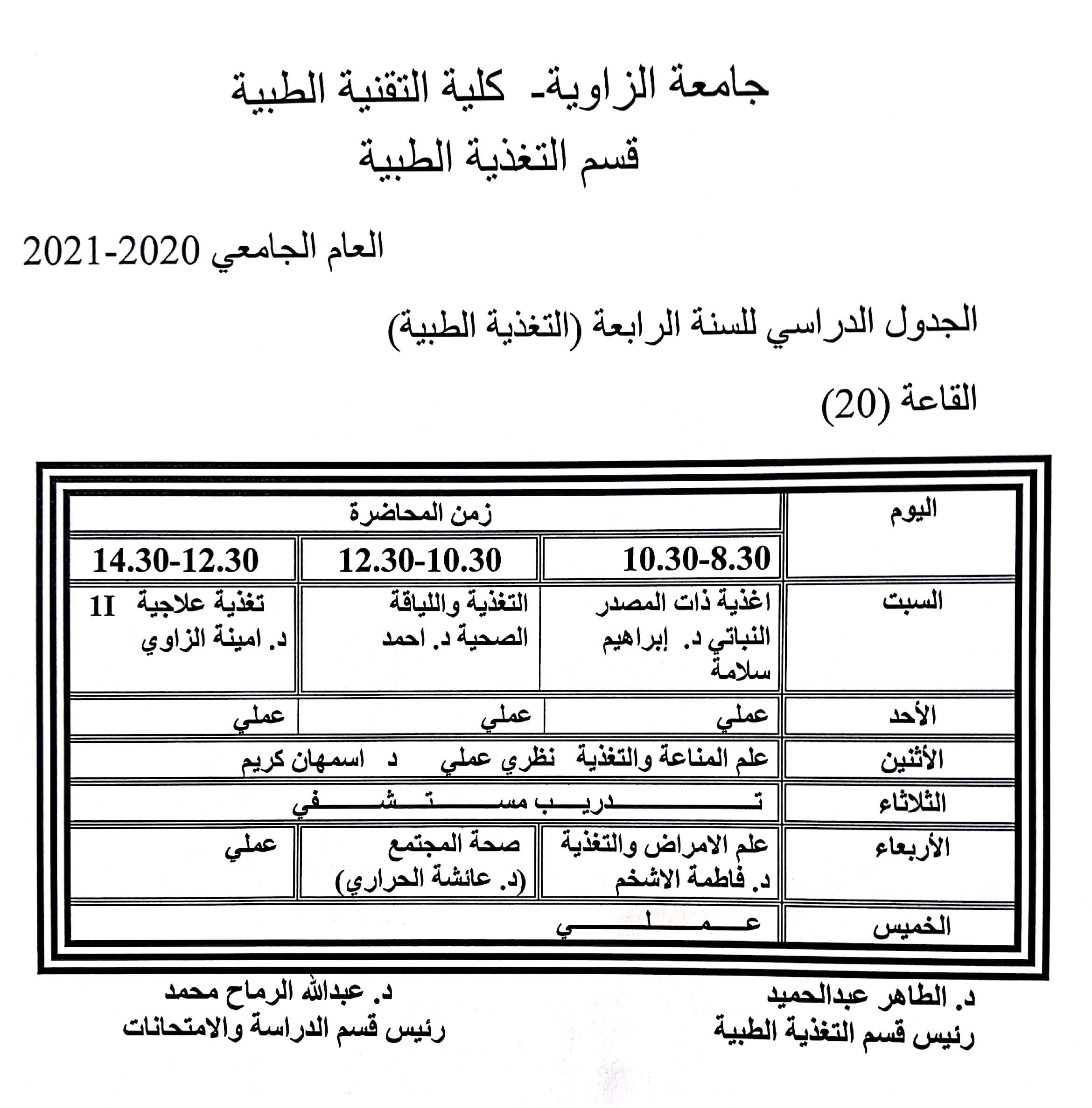 الجدول الدراسي للسنة الرابعة للعام الجامعي 2021/2020م الجدول الدراسي للسنة الرابعة للعام الجامعي 2021/2020م