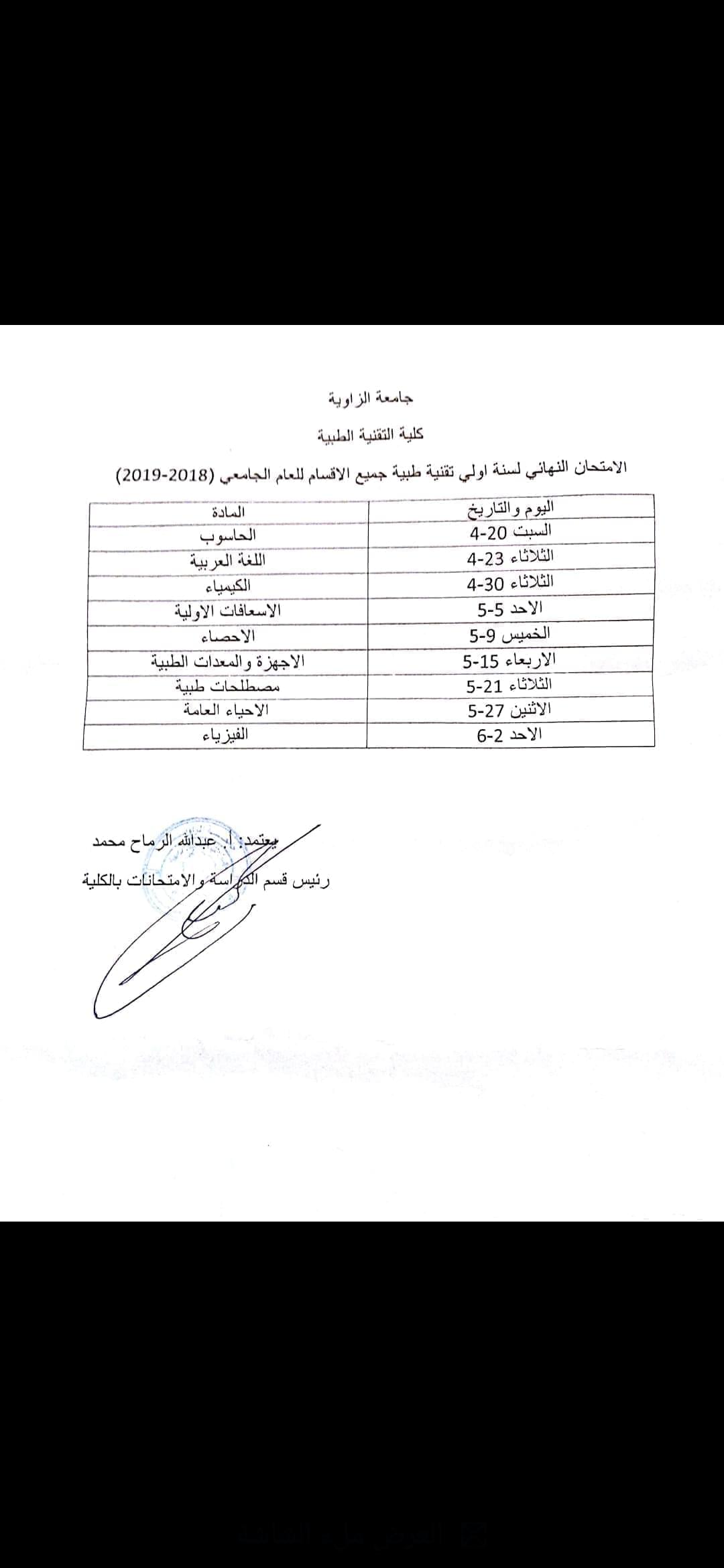 يعلن قسم الدراسة والامتحانات بالكلية عن جدول الامتحان النهائي للسنة الاولى والخاص بجميع الأقسام العلمية للعام الجامعي (2019/2018) .. صورة الجدول مرفقة بالإعلان .