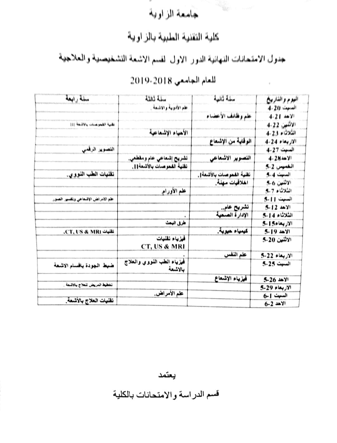 الأعزاء طلبة قسم المختبرات الطبية وقسم الأشعة التشخيصية والعلاجية .. مرفق بهذا الإعلان الجداول المعدلة الخاصة بأقسامكم للإمتحانات النهائية الدور الأول .. سائلين الله التوفيق للجميع .