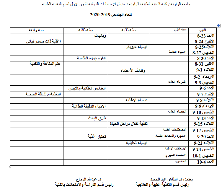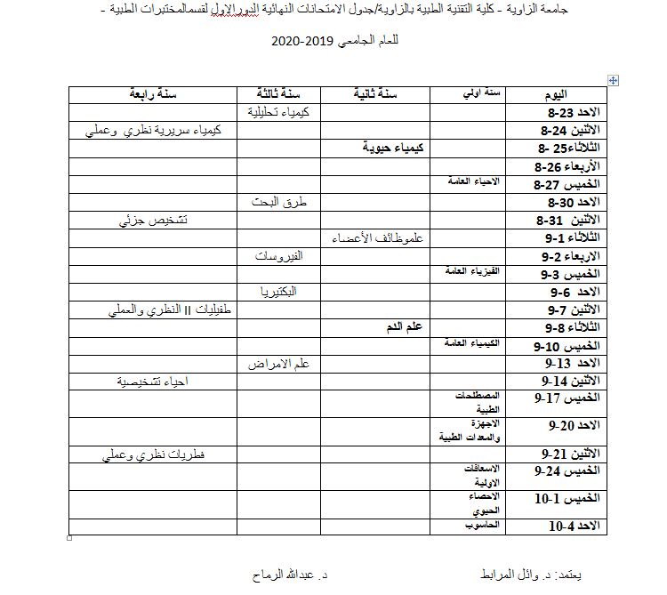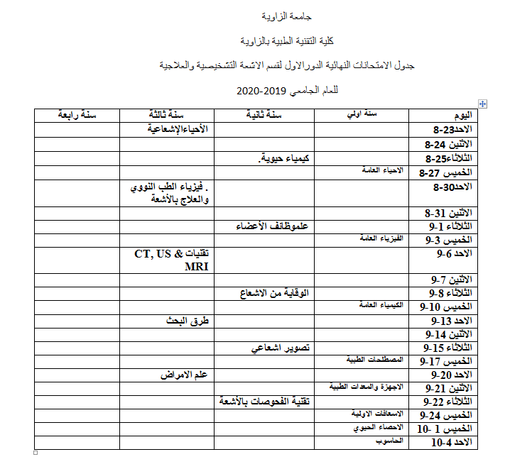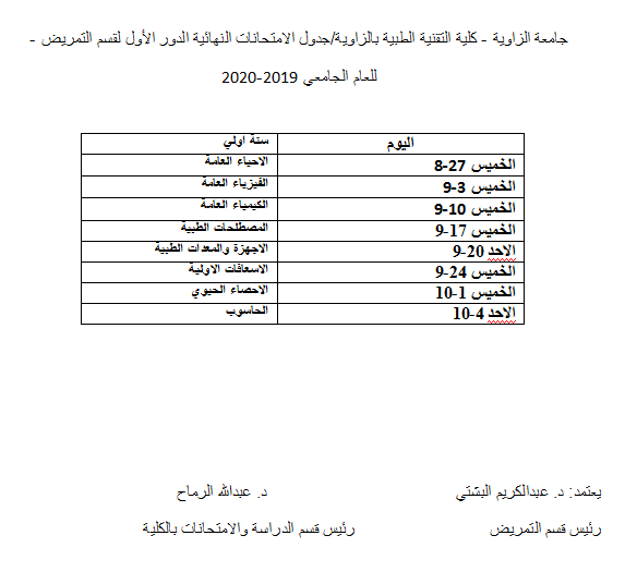 جداول الامتحانات النهائية للعام الدراسي 2019/2020 لجميع الاقسام والسنوات بالكلية