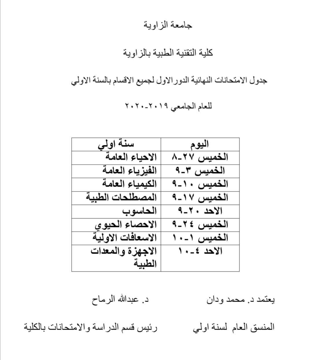 نرفق لكم أدنى هذا الإعلان بمعرض الصور جدول الإمتحانات النهائية الخاصة بكم للعام الجامعي الحالي 2020/2019م .