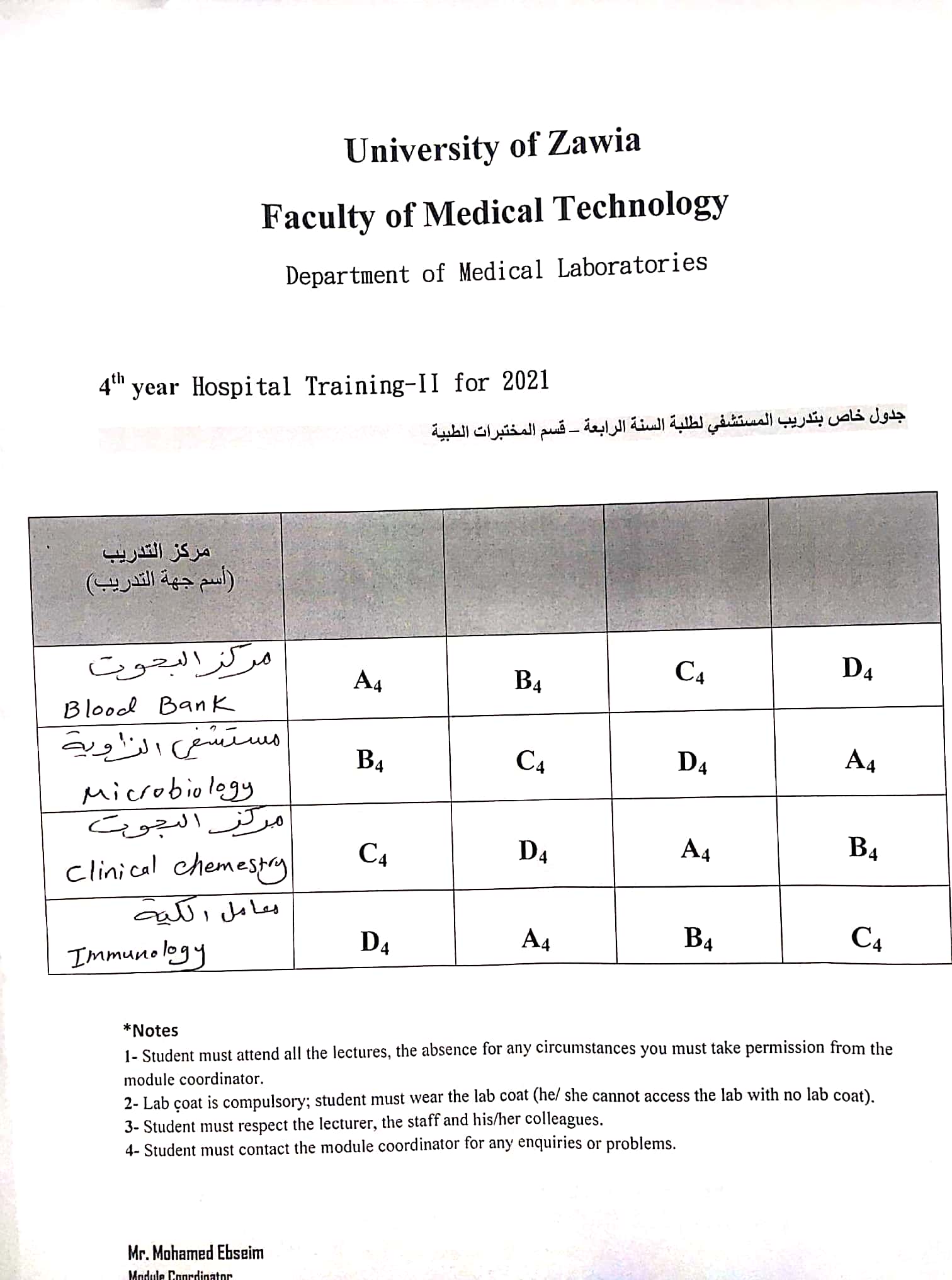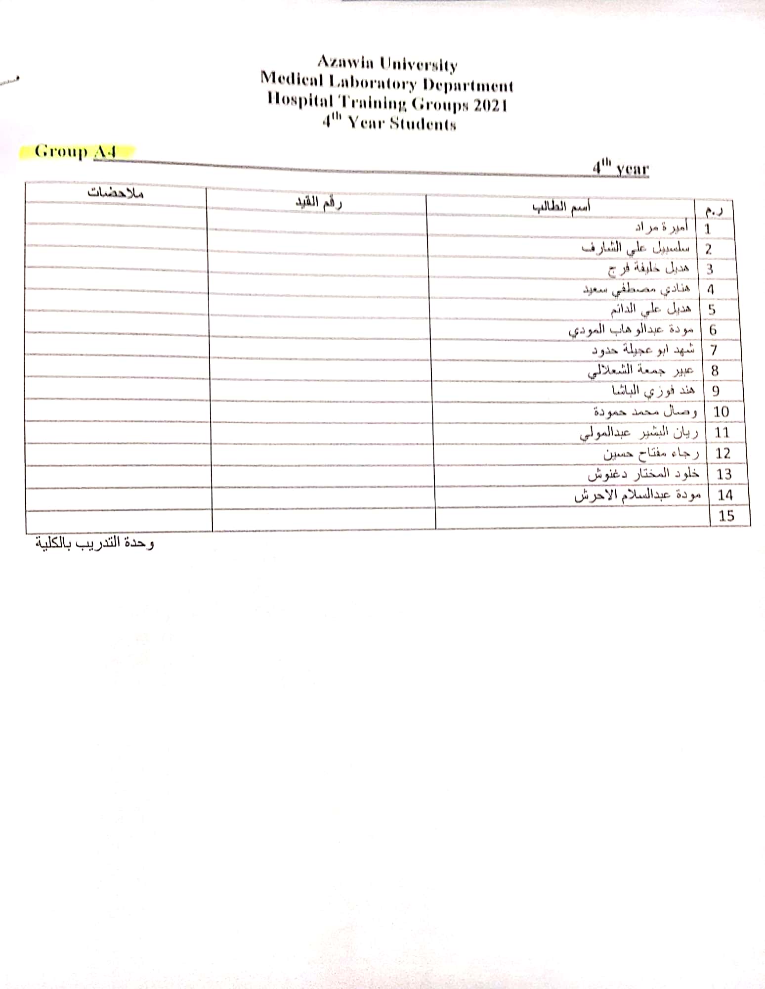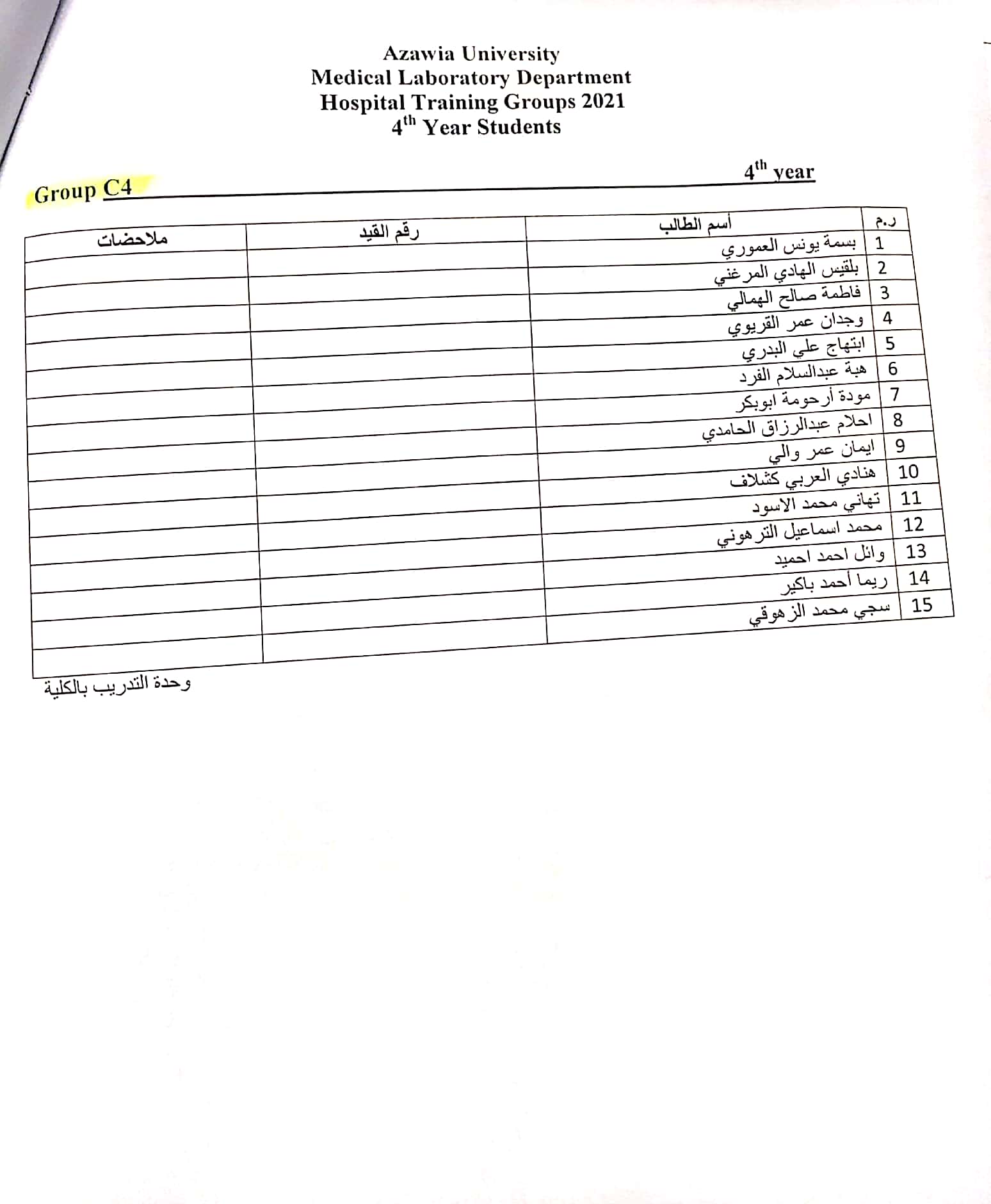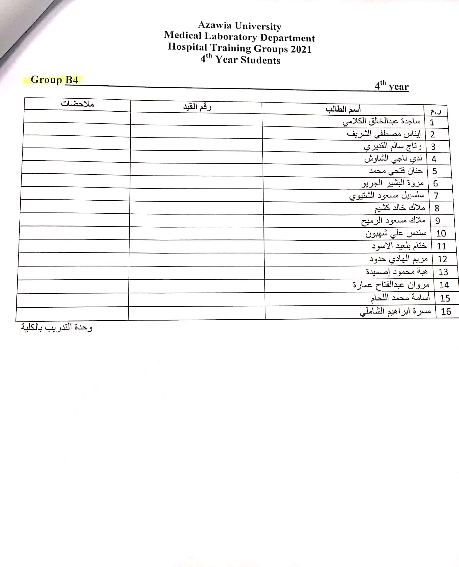 قوائم مجموعات تدريب المستشفى للسنة الرابعة بقسم المختبرات الطبية