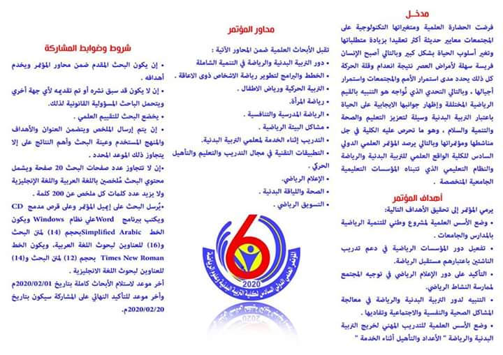 مواعيد : أخر موعد لاستلام الأبحاث كاملة بتاريخ 1/1 2020 م وأخر موعد للتأكيد النهائي على المشاركة سيكون بتاريخ 2/2 /2020م . موعد افتتاح المؤتمر هو 16-3-2020م وموعد الإختتام هو 19-3-2020م