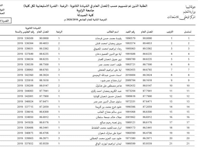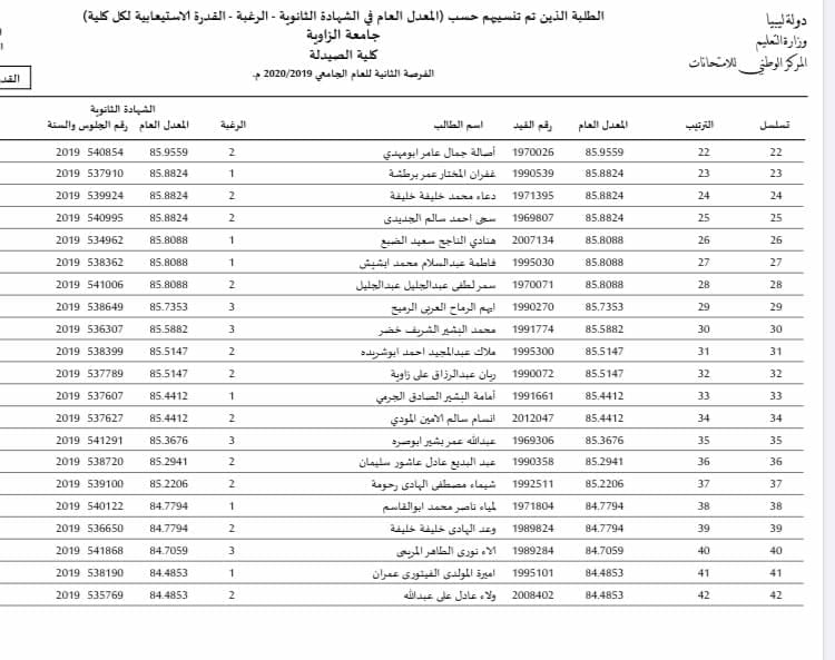 قوائم الفرصه الثانية للعام الجامعي 2019-2020 على الطلبه الوارده اسمائهم في القوائم التوجه إلى إدارة المسجل العام مصحوبينبالمستندات التاليه