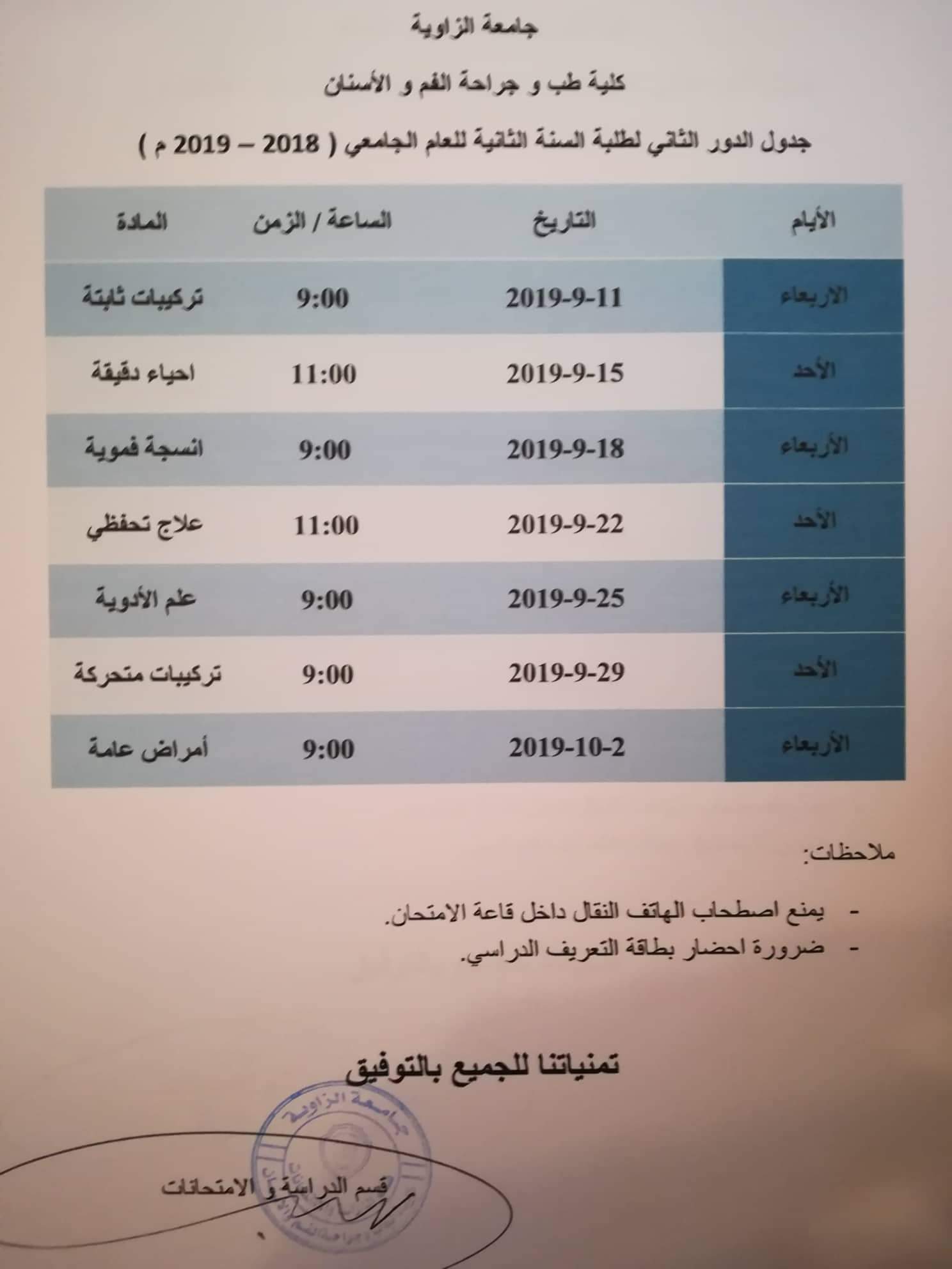 جدول الدور الثاني لطلبة السنة الثانية للعام الجامعي (2018_2019 م)