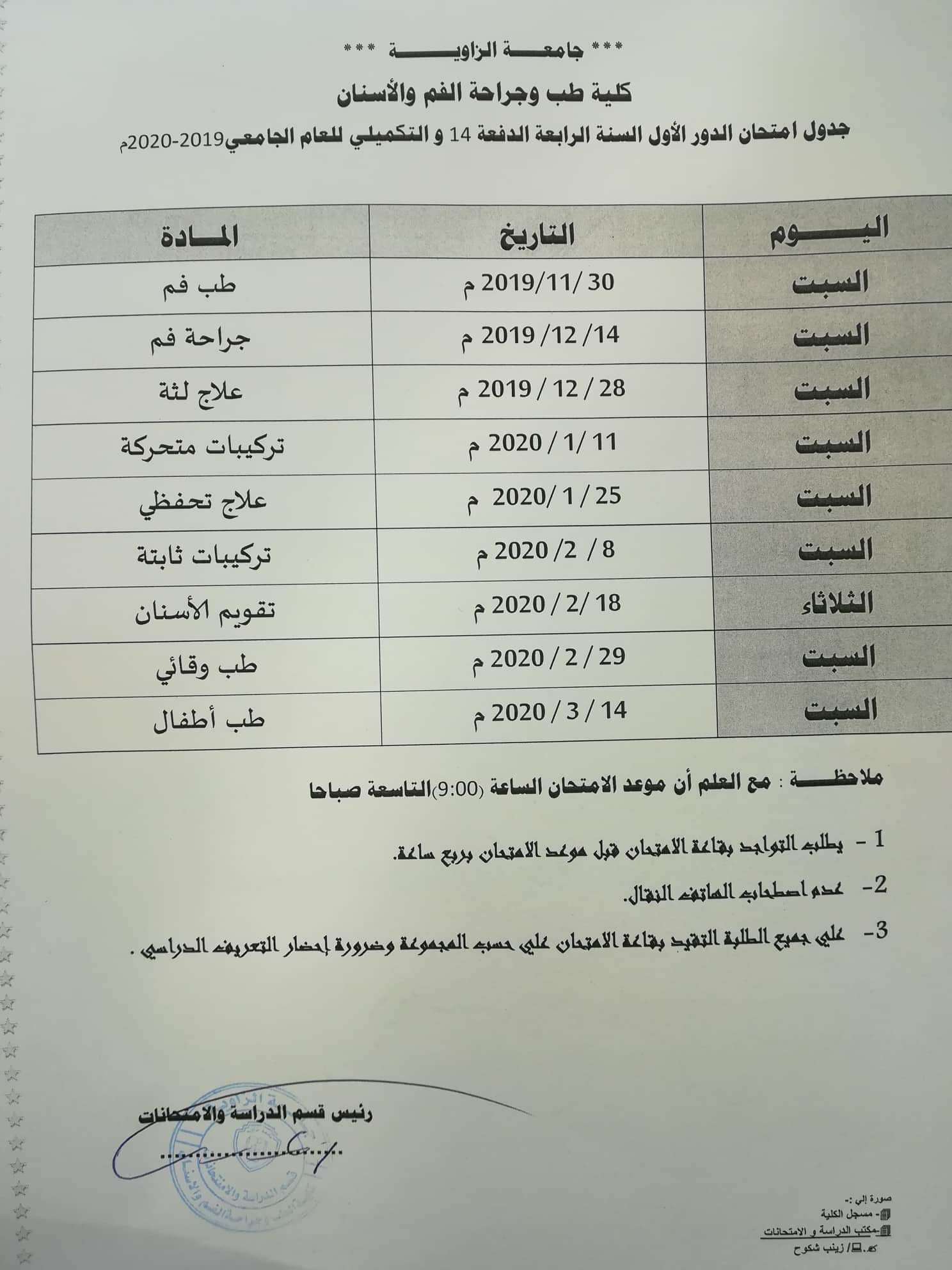 جدول امتحانات النظري السنة الرابعة الدور الأول الدفعة 14 والتكميلي