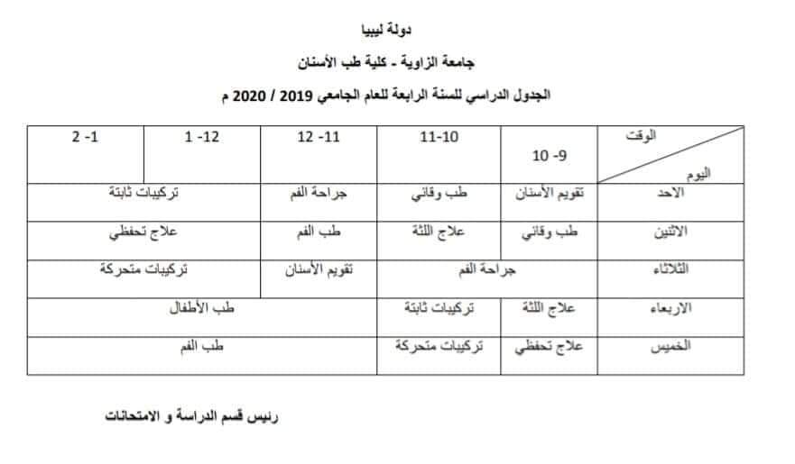الجدول الدراسي الخاص بطلبة السنة الرابعة أسنان