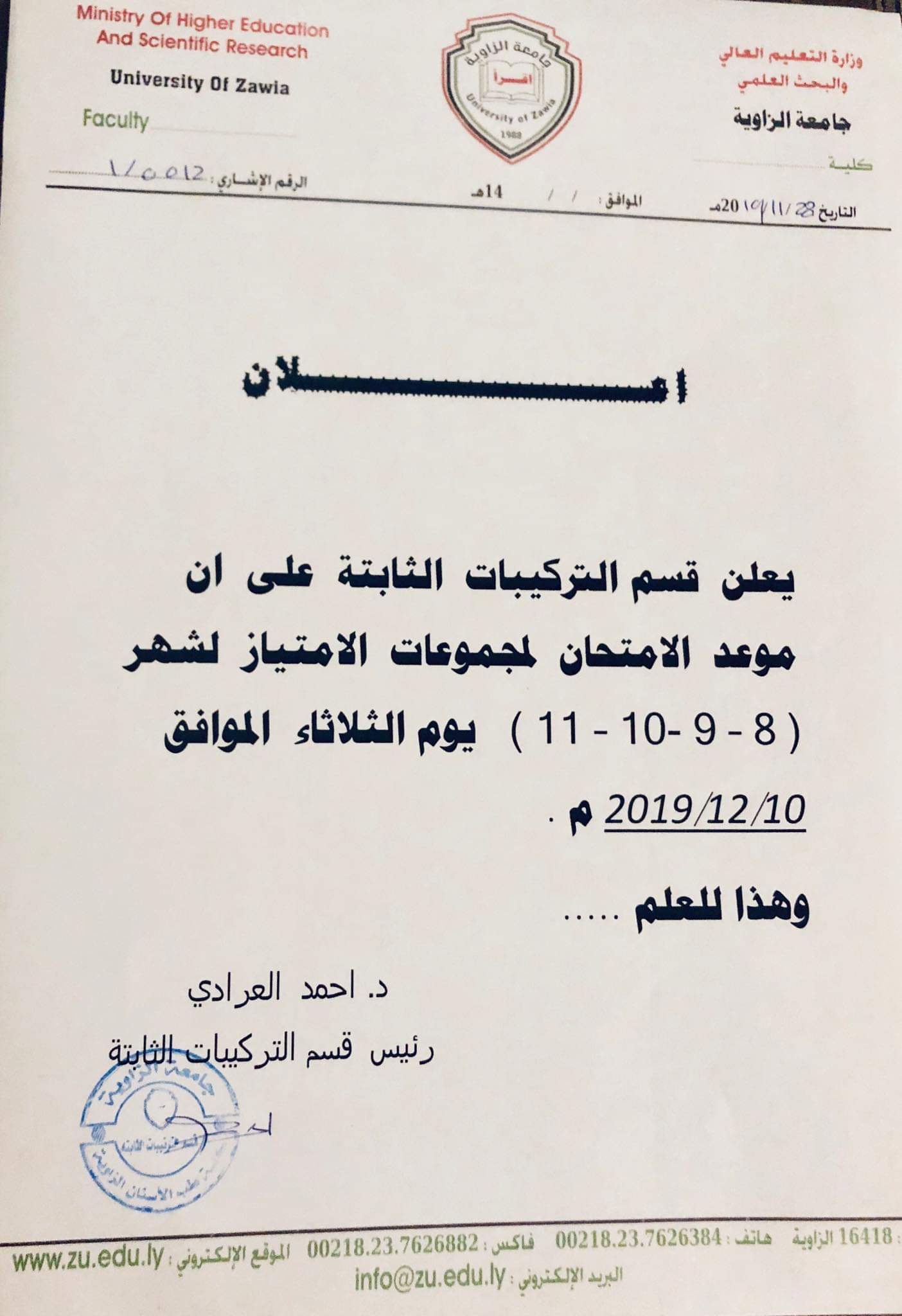 إعلان.. يعلن قسم التركيبات الثابتة بأن موعد الأمتحان لمجموعات الأمتياز لشهر (8_9_10_11) يوم الثلاثاء الموافق 10_12_2019.موهذا للعلم....