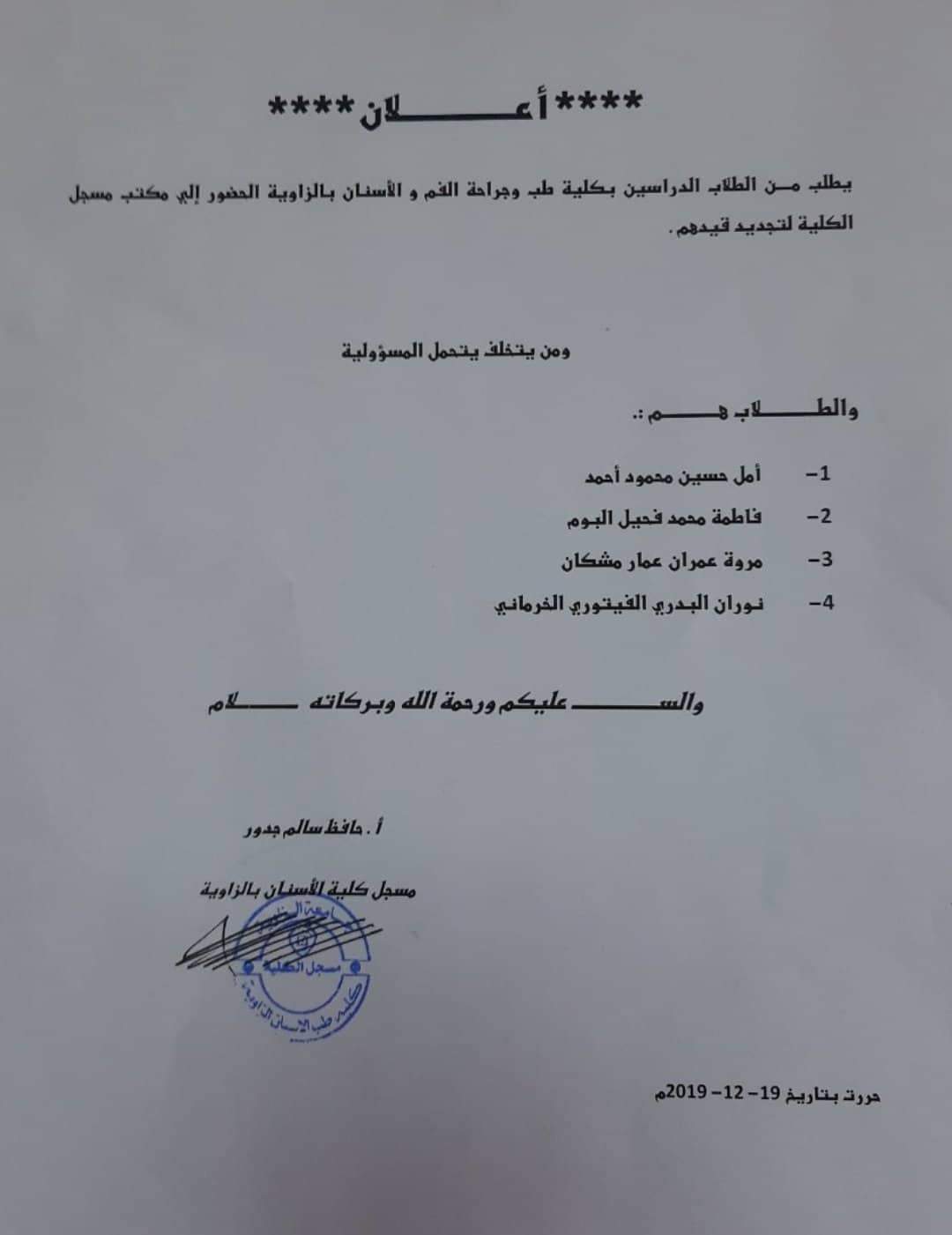يطلب من الطلبة الآتية اسمائهم الدارسين بكلية طب وجراحة الفم والأسنان بجامعة الزاوية الحضور لمكتب المسجل بالكلية لتجديد قيدهم