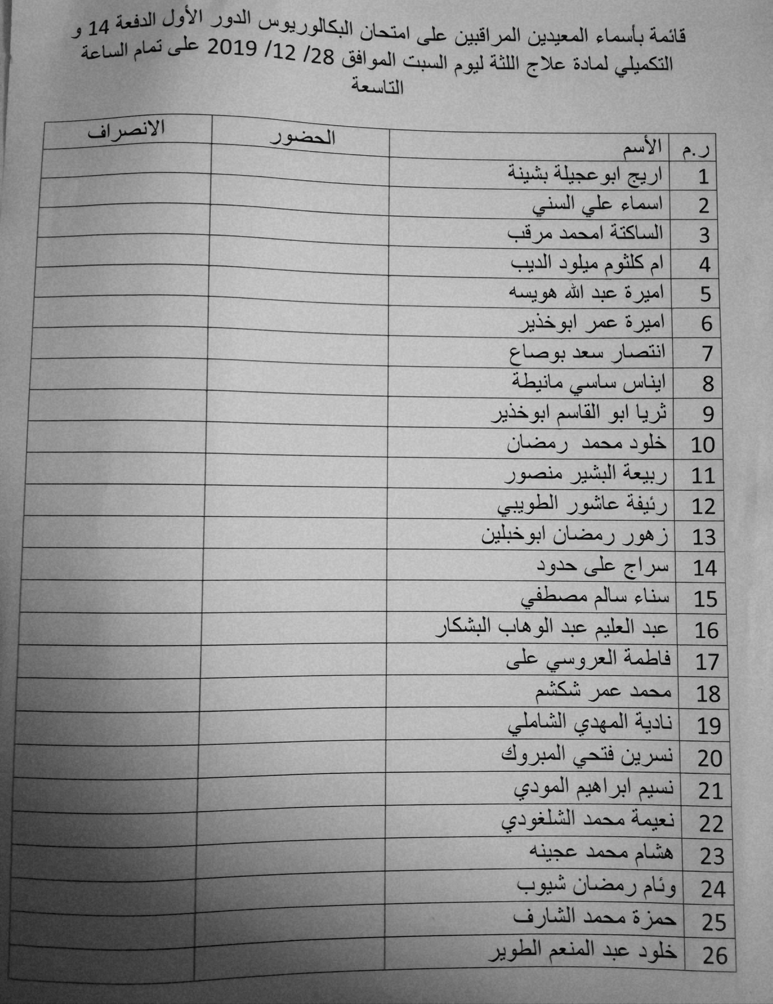 قائمة بأسماء المعيدين المراقبين على امتحان الدور الأول الدفعة 14 والتكميلي ليوم السبت الموافق 28 / 12 / 2019 لمادة علاج اللثه على تمام الساعة 9 يرجى الالتزام بالحضور