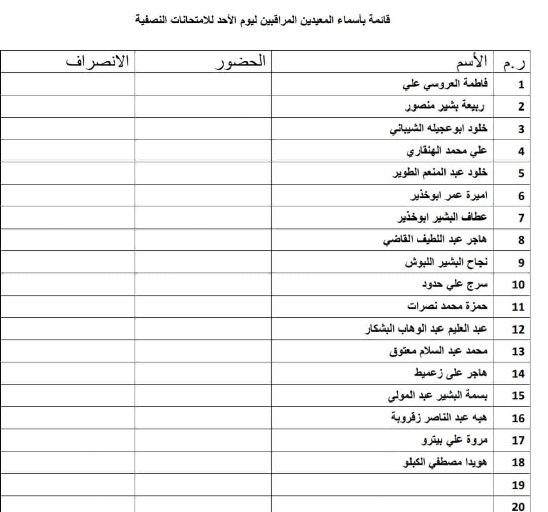قائمة بأسماء المعيدين المراقبين على امتحان النصفي ليوم غذا الأحد
