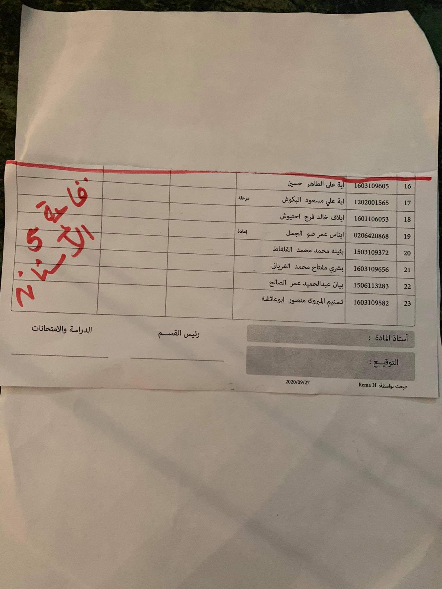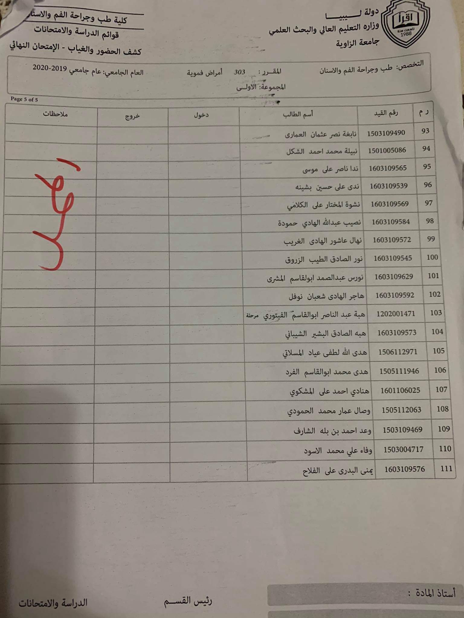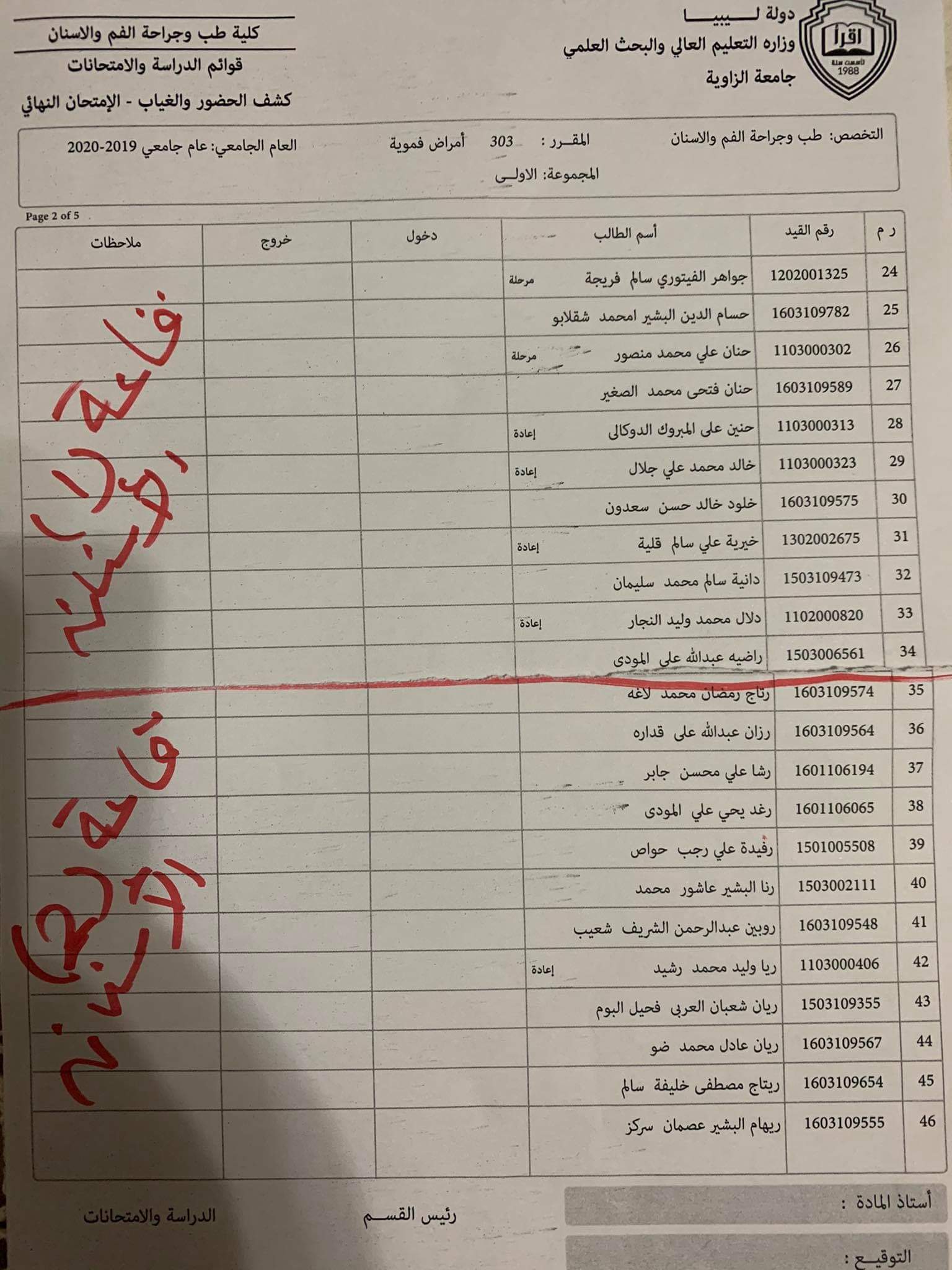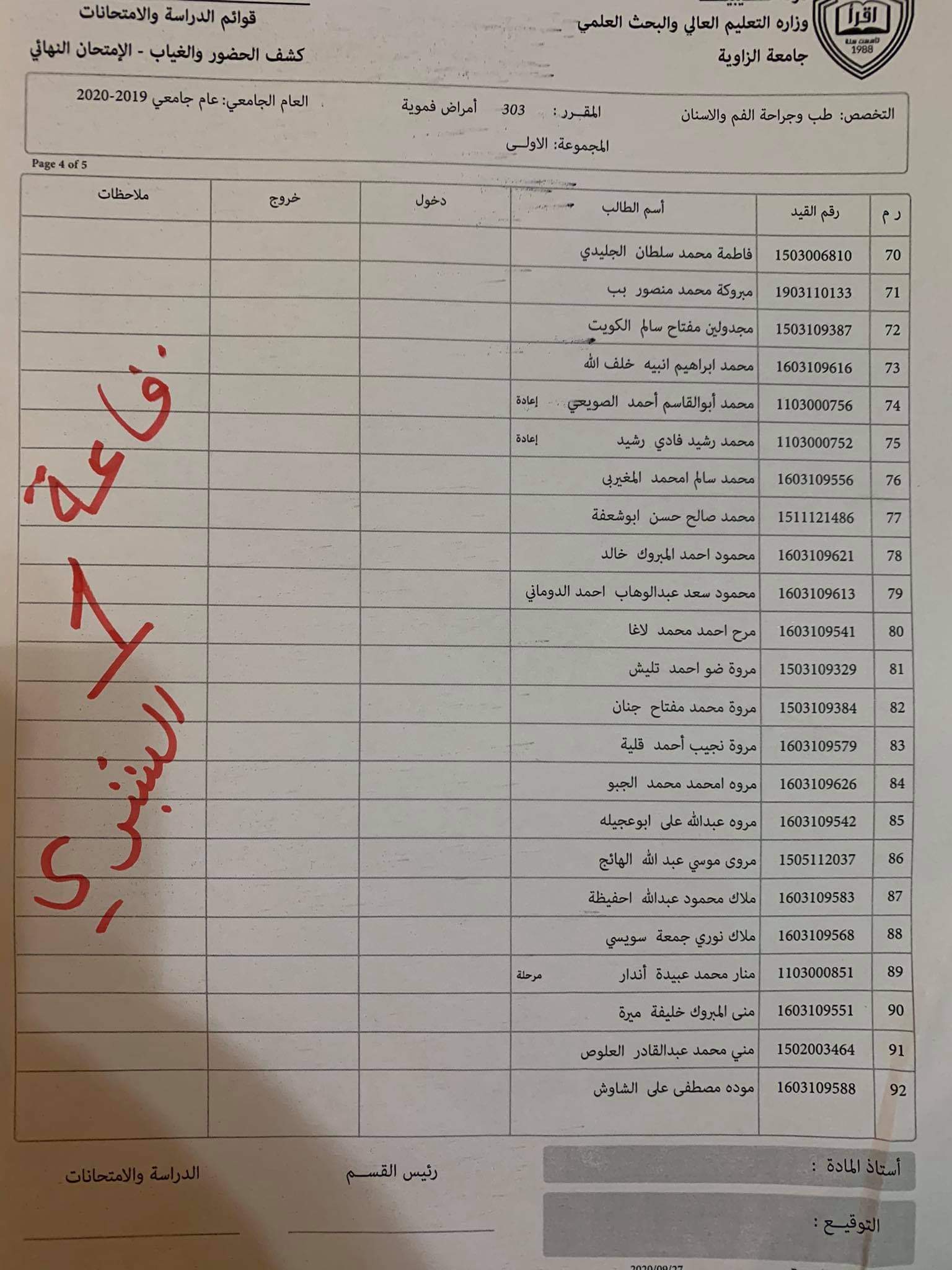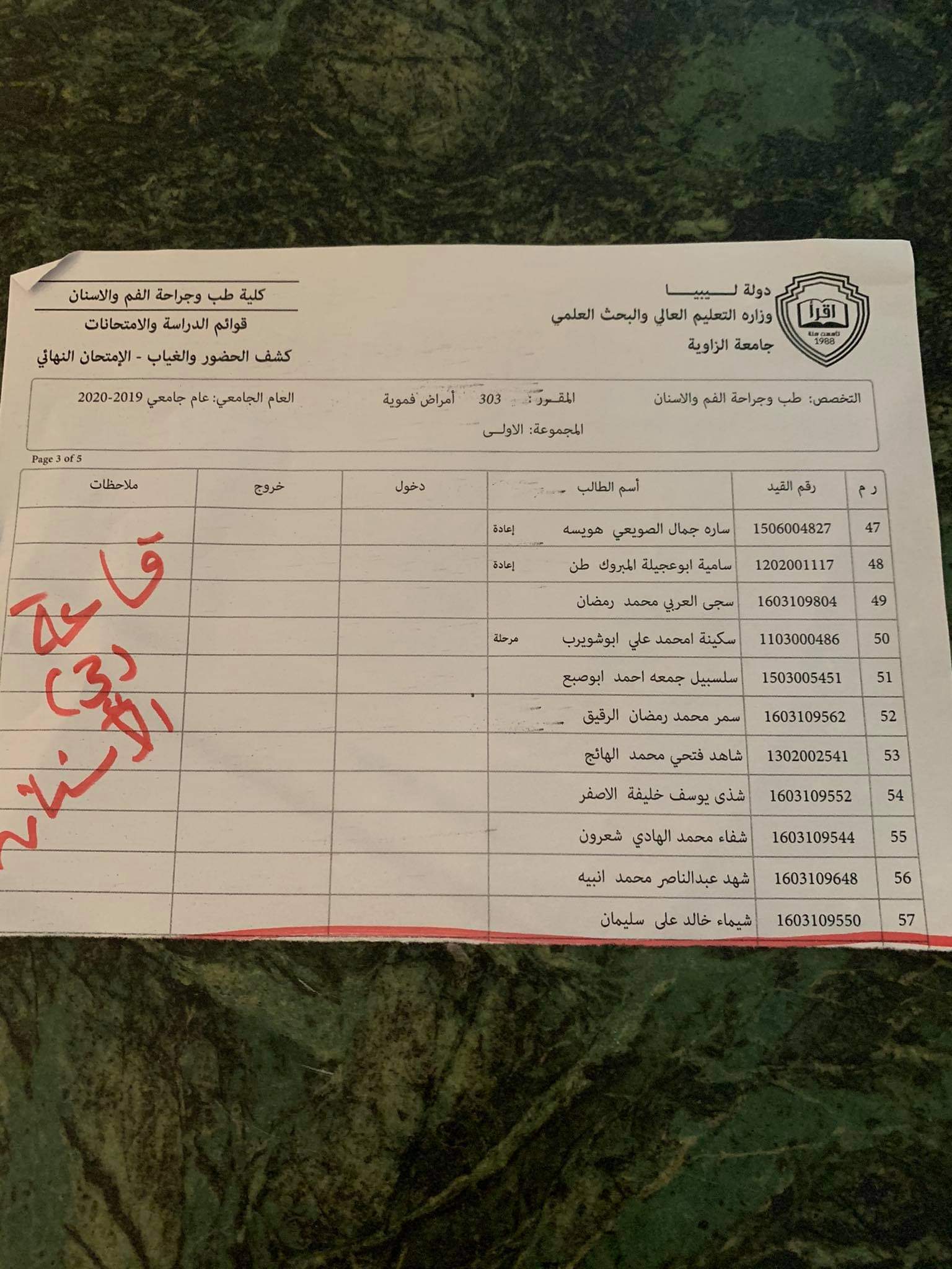 قوائم توزيع القاعات للامتحان الدور الأول السنة الثالثه لمادة الأمراض الفموية ليوم غذا الثلاثاء الموافق 6 / 10 / 2020 على تمام الساعه 9
