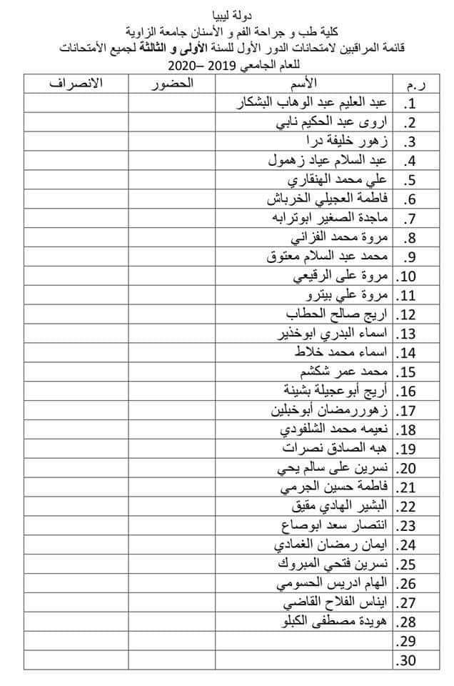 قائمة المعيدين المراقبين على امتحان السنة الأولى الدور الأول ليوم غذا الأربعاء لمادة التشريح العام الموافق 7 / 10 / 2020 على تمام الساعه 9