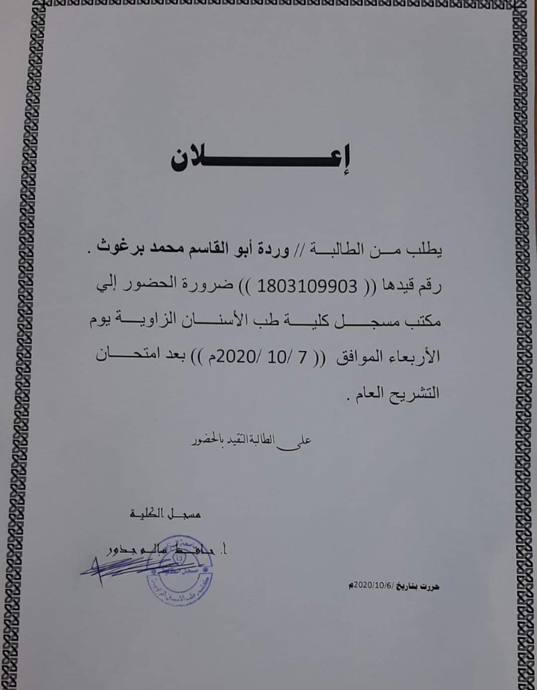 يطلب من الطالبة وردة ابو القاسم محمد برغوث ضرورة الحضور الي مكتب مسجل كلية طب وجراحة الفم والأسنان بالزاوية يوم الأربعاء الموافق 7/10/2020 بعد امتحان التشريح.