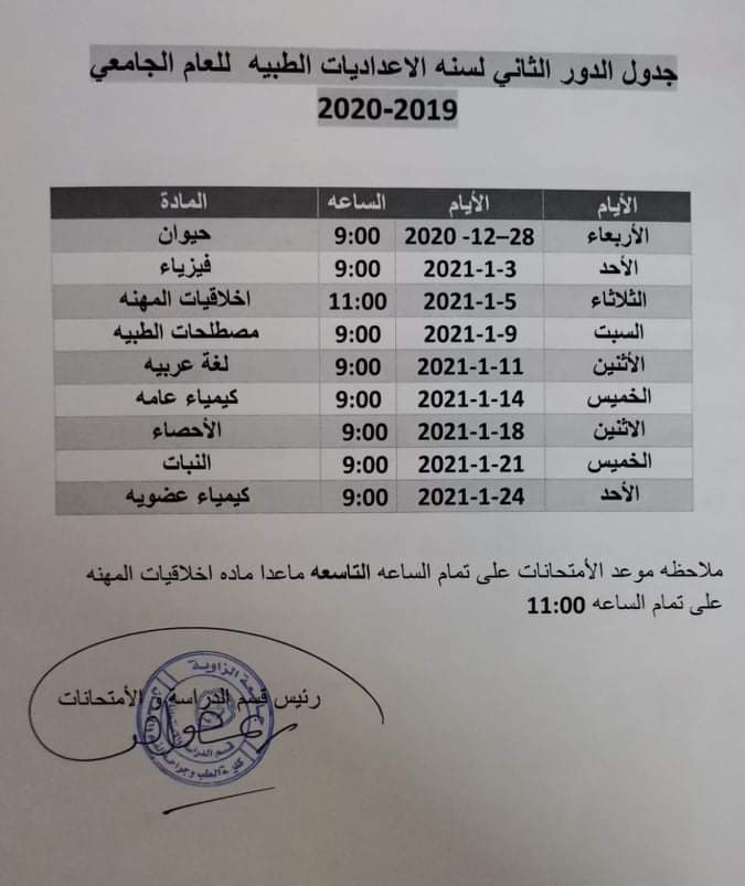 جدول امتحانات الدور الثاني للسنه الأولى والاعداديات الطبية للعام الجامعي 2019 - 2020