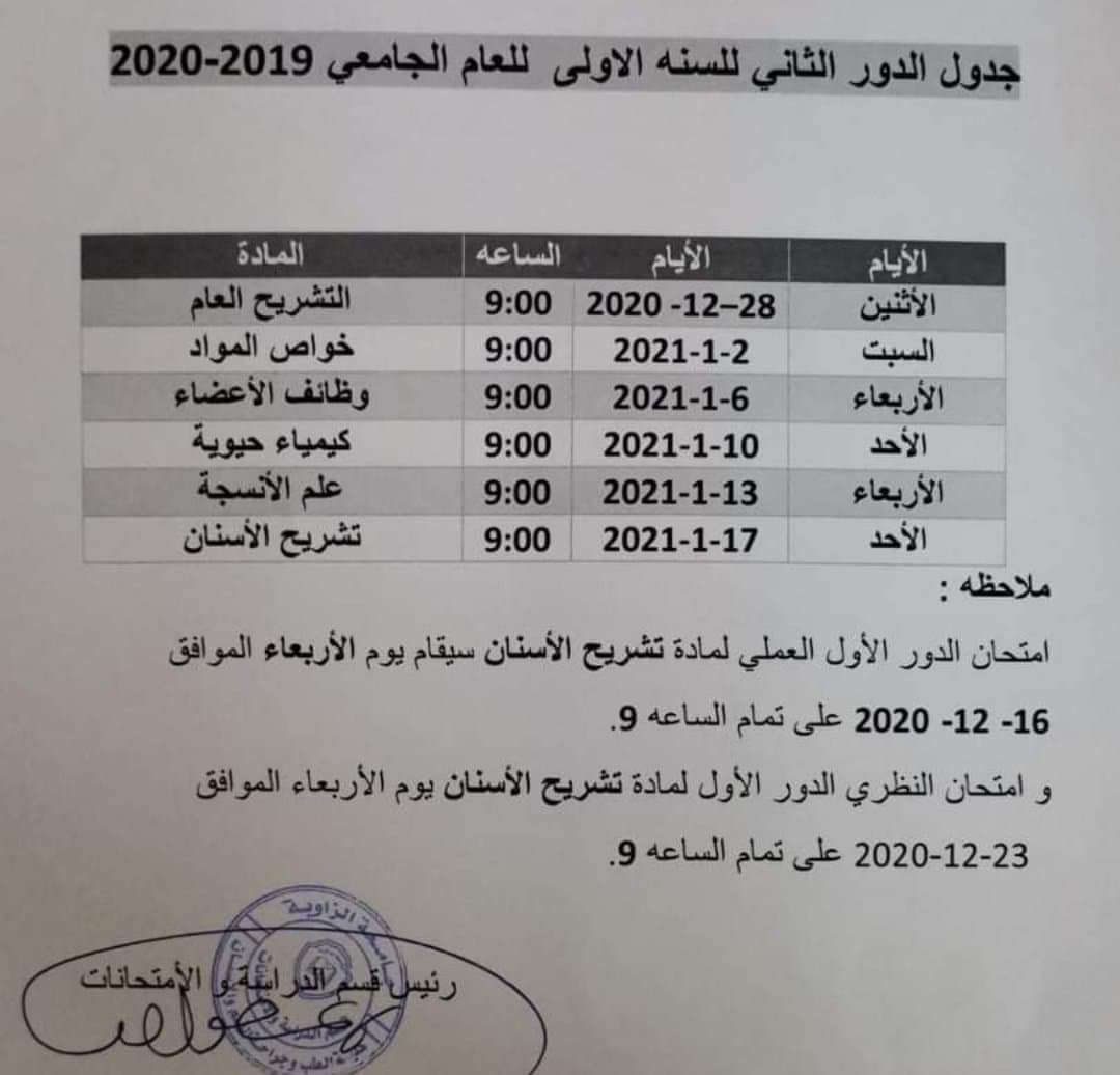 جدول السنه الأولى الدور الثاني للعام الجامعي 2019 2020