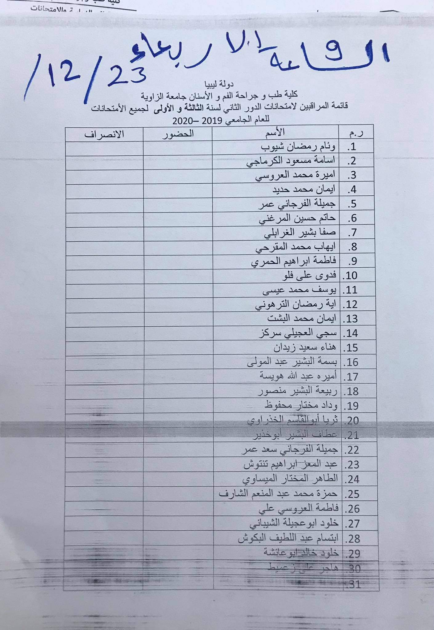 قائمة المراقبين على امتحان الدور الثاني لطلبة السنة الأولي لمادة تشريح الأسنان