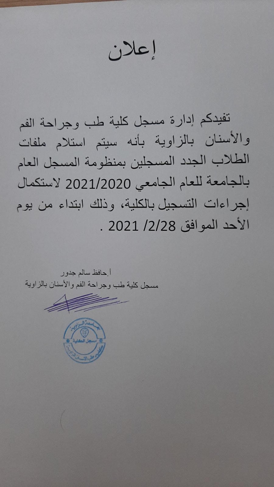 تفيدكم إدارة مسجل كلية طب وجراحة الفم والأسنان بالزاوية بأنه سيتم استلام ملفات الطلاب الجدد المسجلين بمنظومة المسجل العام بالجامعه للعام الجامعي 2020_2021لاستكمال إجراءات التسجيل بالكلية وذلك ابتداء من يوم الأحد الموافق 28/2/2021.