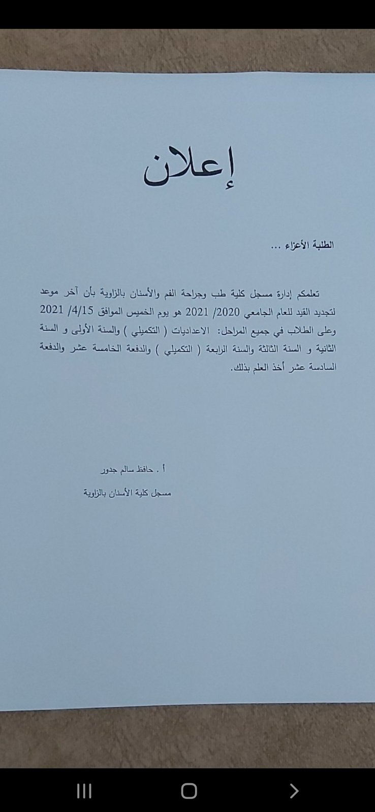 تعلمكم إدارة مسجل كلية طب وجراحة الفم والأسنان بالزاوية بأن أخر موعد لتجديد القيد للعام الجامعي 2020_2021 هو يوم الخميس الموافق 15_4_2021 علي الطلاب في جميع  المراحل الاعداديات (التكميلي) السنة الأولي السنة الثانية والسنة الثالثة والسنة الرابعة( التكميلي) الدفعة الخامسة عشر والدفعة السادسة عشر أخد العلم بذلك