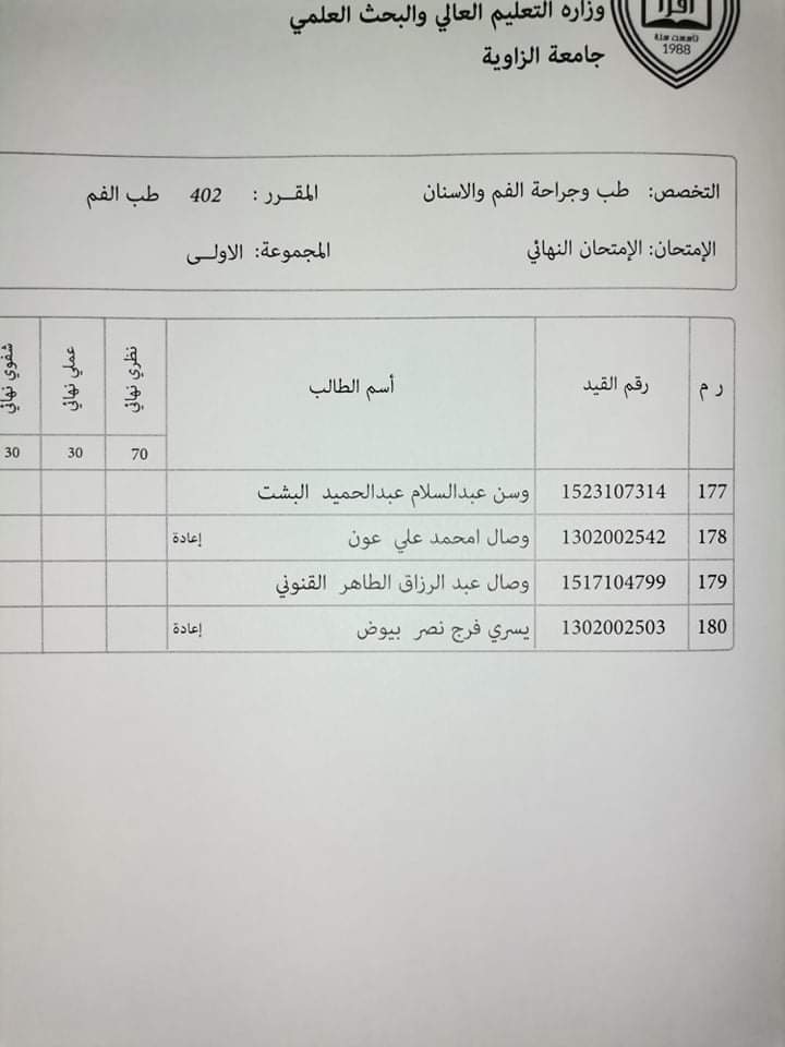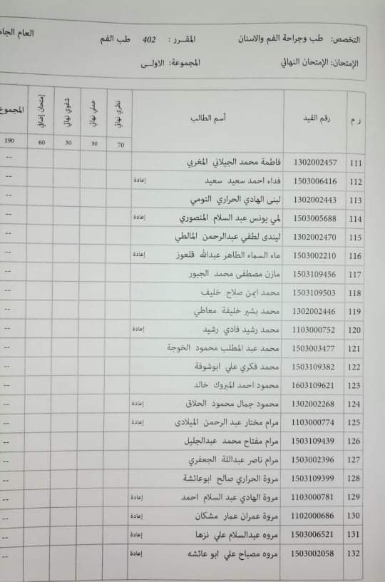 قوائم الطلبه للامتحان العملي ليوم غذا الاثنين لمادة طب الفم ،،المجموعه الأولى من رقم 1الي 90،،حسب التسلسل في القائمة من الساعه 9:00 الي 11:30 ،،،المجموعه الثانيه من رقم 91الي اخر القائمة من الساعه 11:30 إلى الساعه 2:00