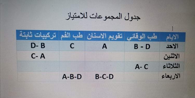 جدول مجموعات الامتياز للدفعه 14 والتكميلي..الرجاء التقيد بالمجموعات المرفقة للجدول إبتداً من يوم غذا الأحد الموافق 12 - 9 - 2021 ،،يرجى الإلتزام بالحضور والإجراءات الوقائية