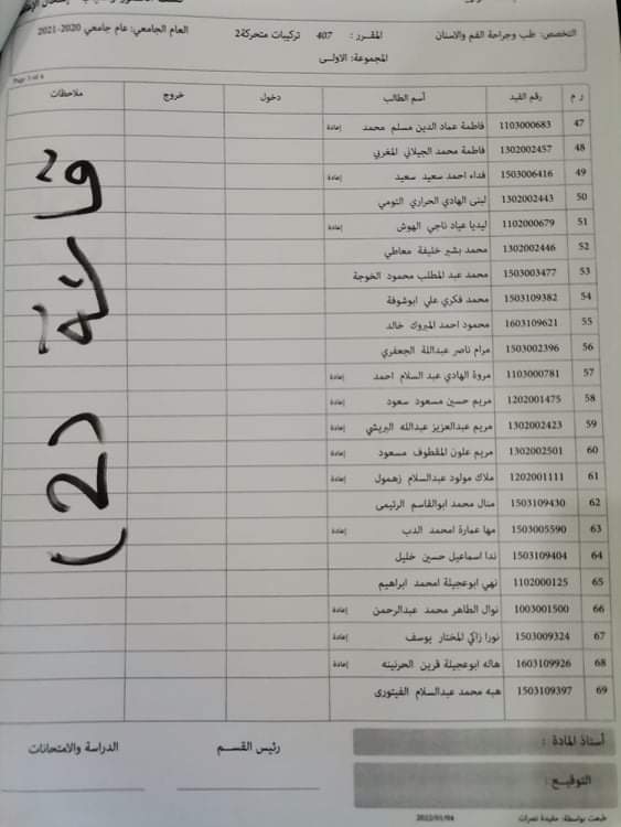 قوائم توزيع القاعات للامتحان الدور الثاني الدفعه 15 والتكميلي ليوم لمادة التركيبات المتحركة ليوم الأحد القادم الموافق 9 / 1 /2022 يرجى الإلتزام بالإجراءات الوقائية ولبس الكمامه وإحضار بطاقة التعريف