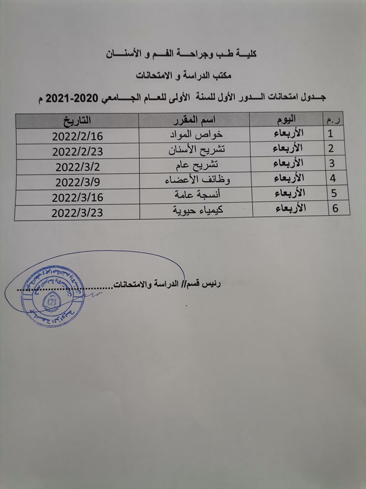 جدول امتحانات الدور الأول السنة الأولى والثانية للعام الجامعي 2020 /2021 م على تمام الساعه 9 يرجى الإلتزام بالإجراءات الوقائية ولبس الكمامه وإحضار بطاقة التعريف ،ويمنع اصطحاب الهاتف