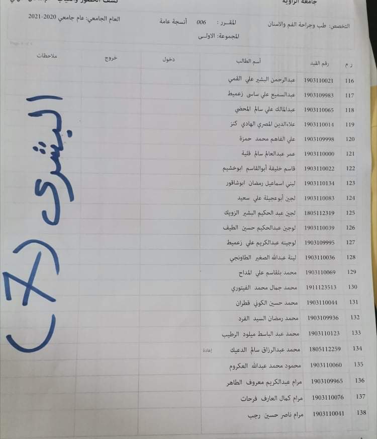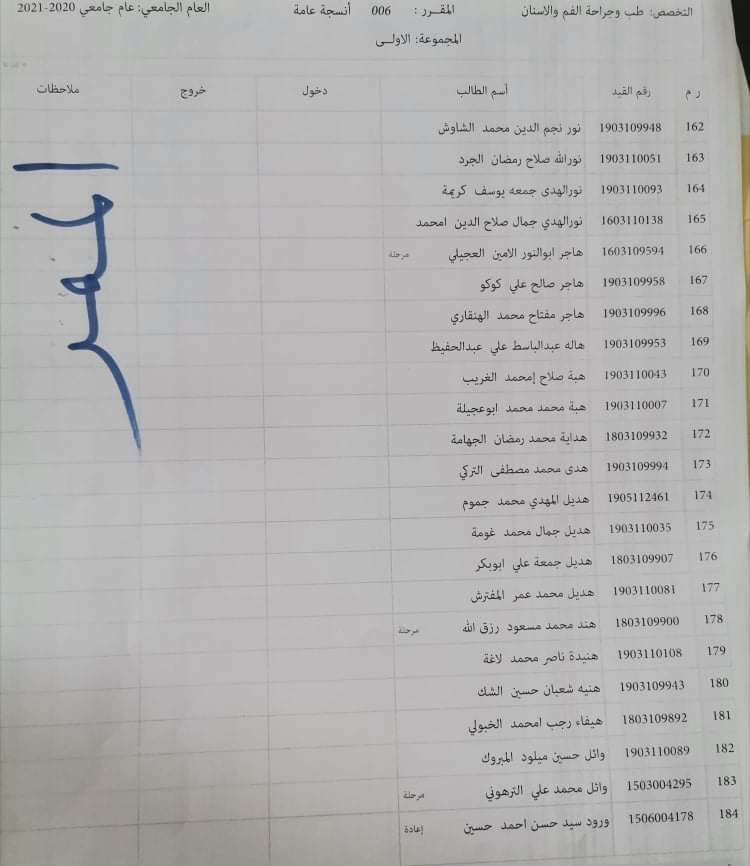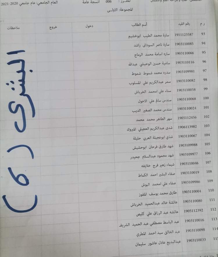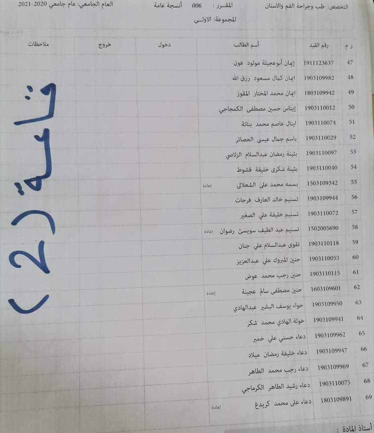 توزيع القاعات للامتحان الدور الأول السنة الأولى للعام الجامعي 2020_2021 لمادة الأنسجة العامة ليوم الأربعاء القادم الموافق 16 / 3 /2022 م على تمام الساعه 9 يرجى الإلتزام بالحضور قبل الموعد بنصف ساعة
